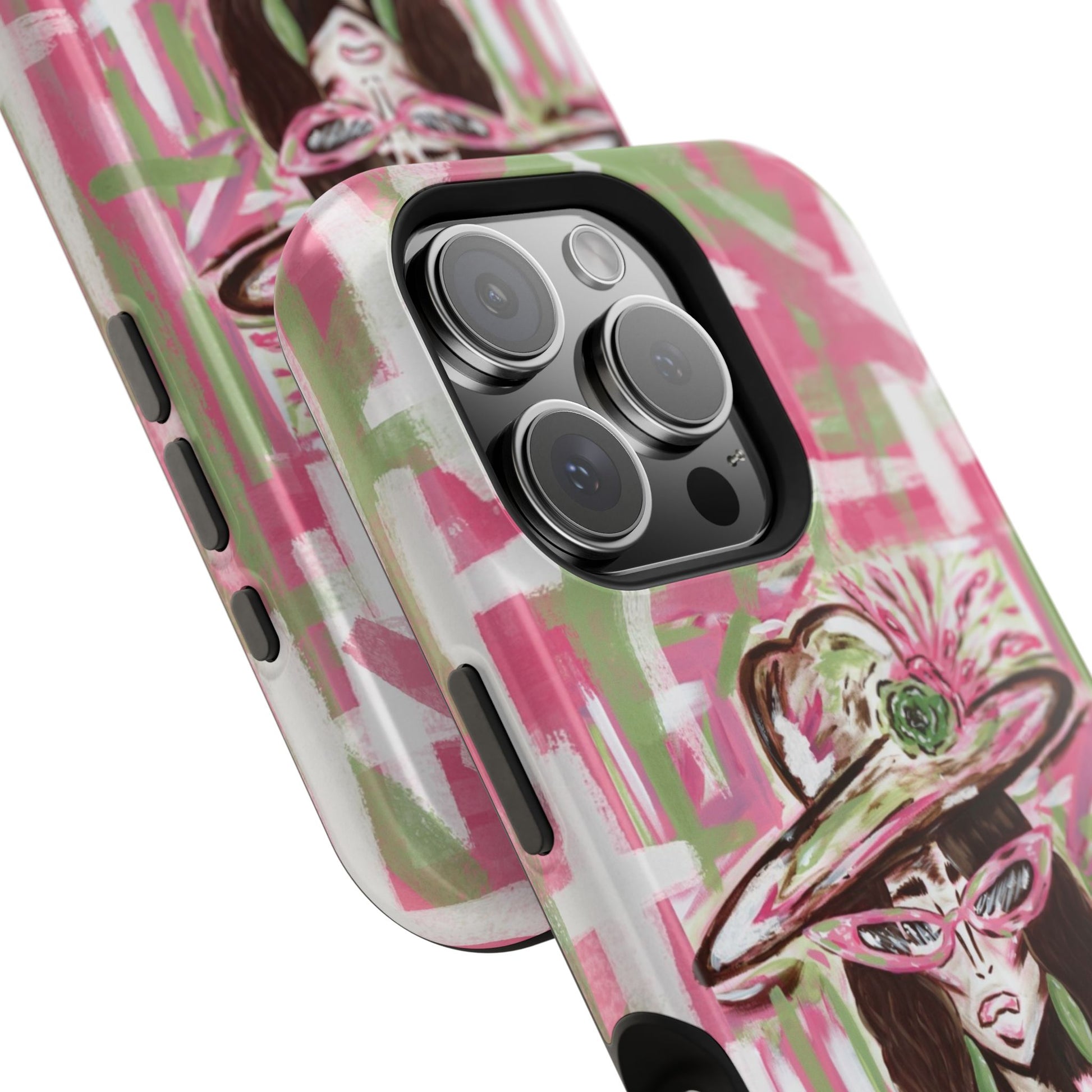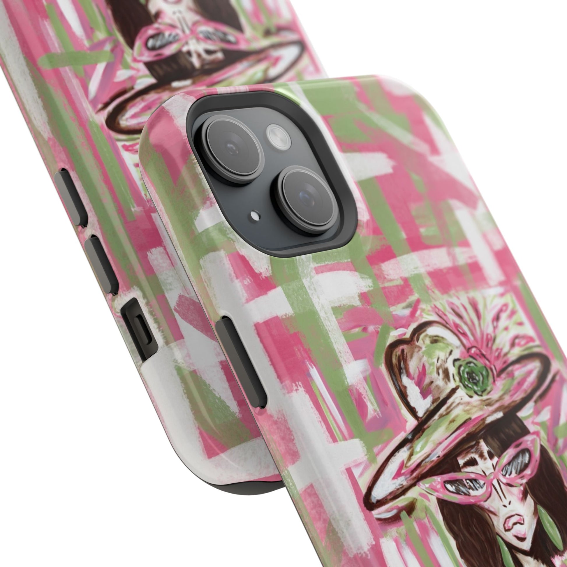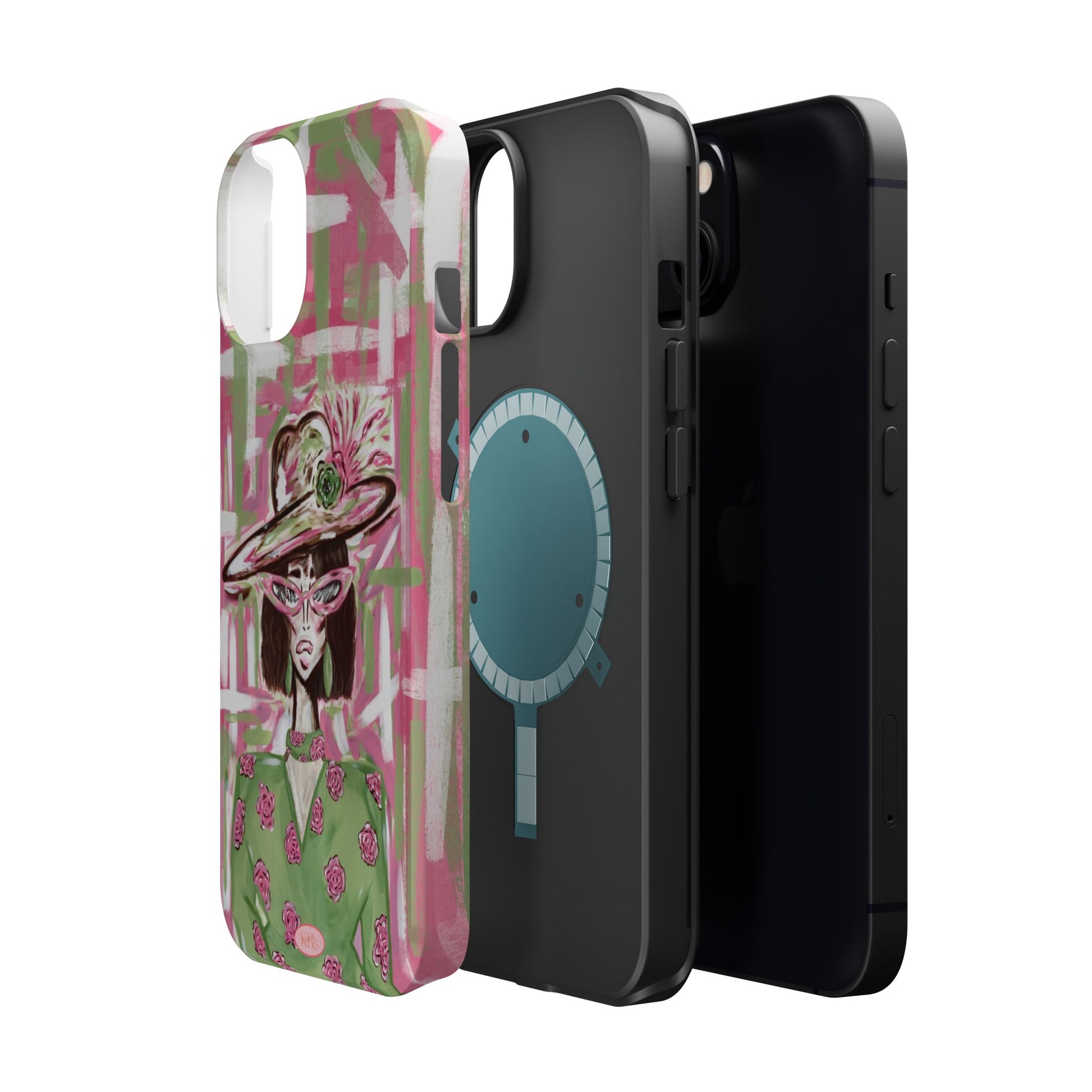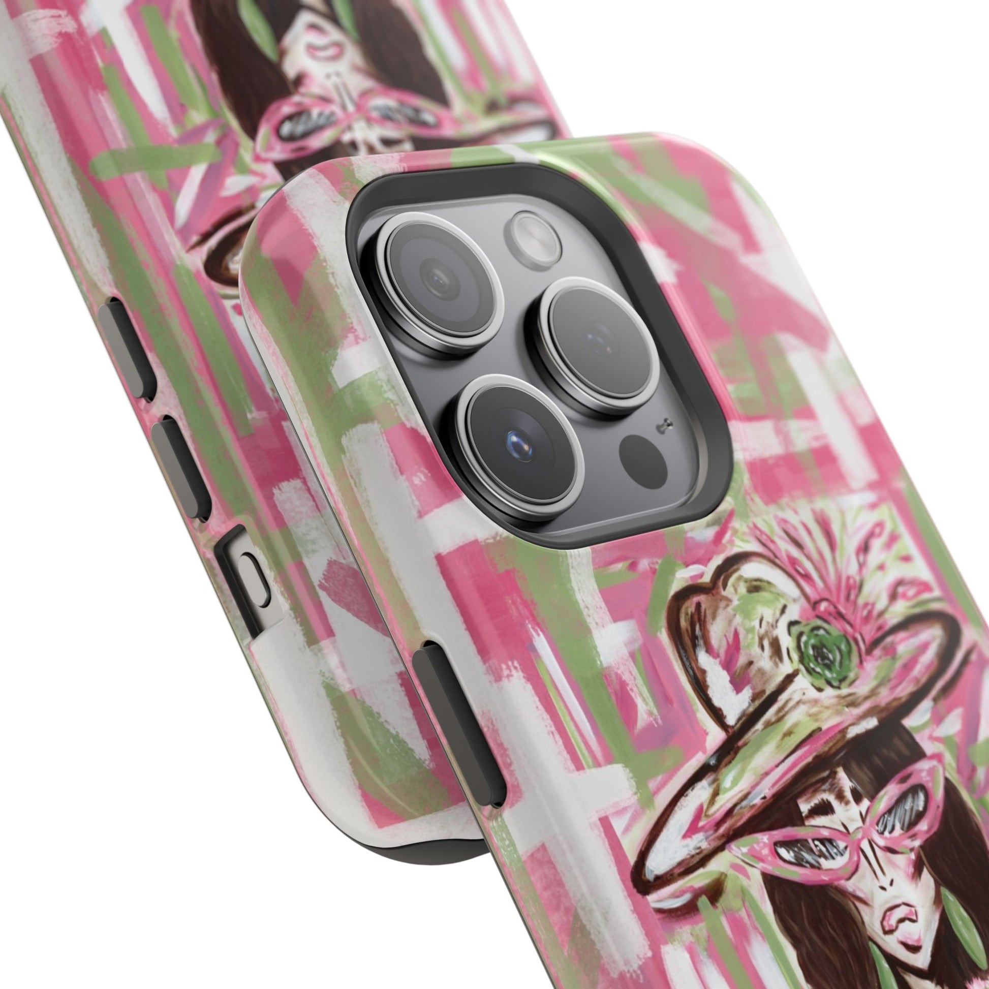 This phone case wraps bold, hand-painted style artwork in a sturdy, impact-resistant shell that keeps your device safe while showing off a playful, fashion-forward look. Bright pinks and soft greens form a layered, graffiti-like background behind a stylized, hat-wearing figure in vintage-inspired attire — a design that reads like street art meets couture. The slim dual-layer build (polycarbonate outer shell + cushioned TPU liner) absorbs shocks and guards against scratches, while the full-wrap print and choice of glossy or matte finish keep the colors vibrant. Built-in magnets support MagSafe-style accessories so the case fits easily into a modern mobile routine without losing flair.