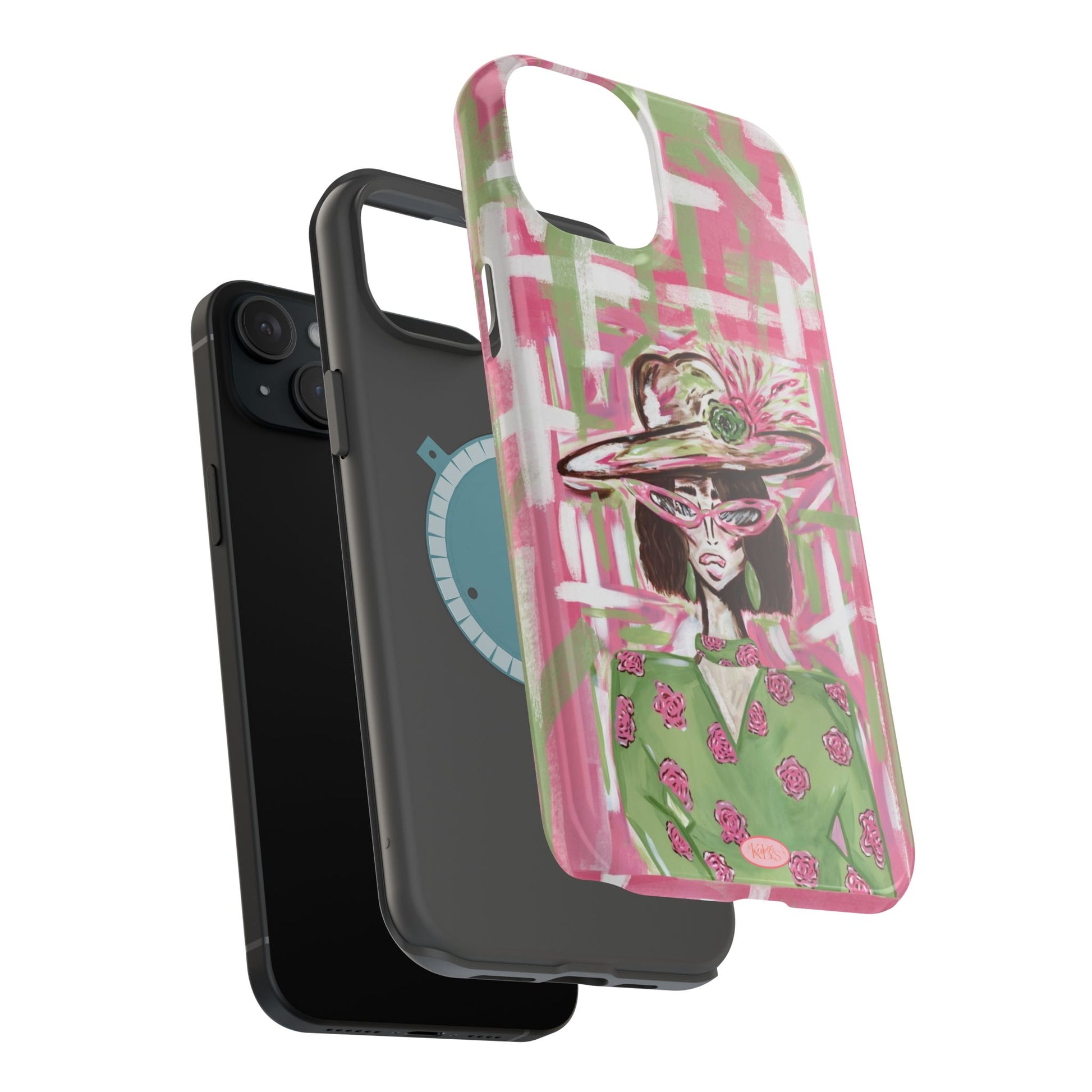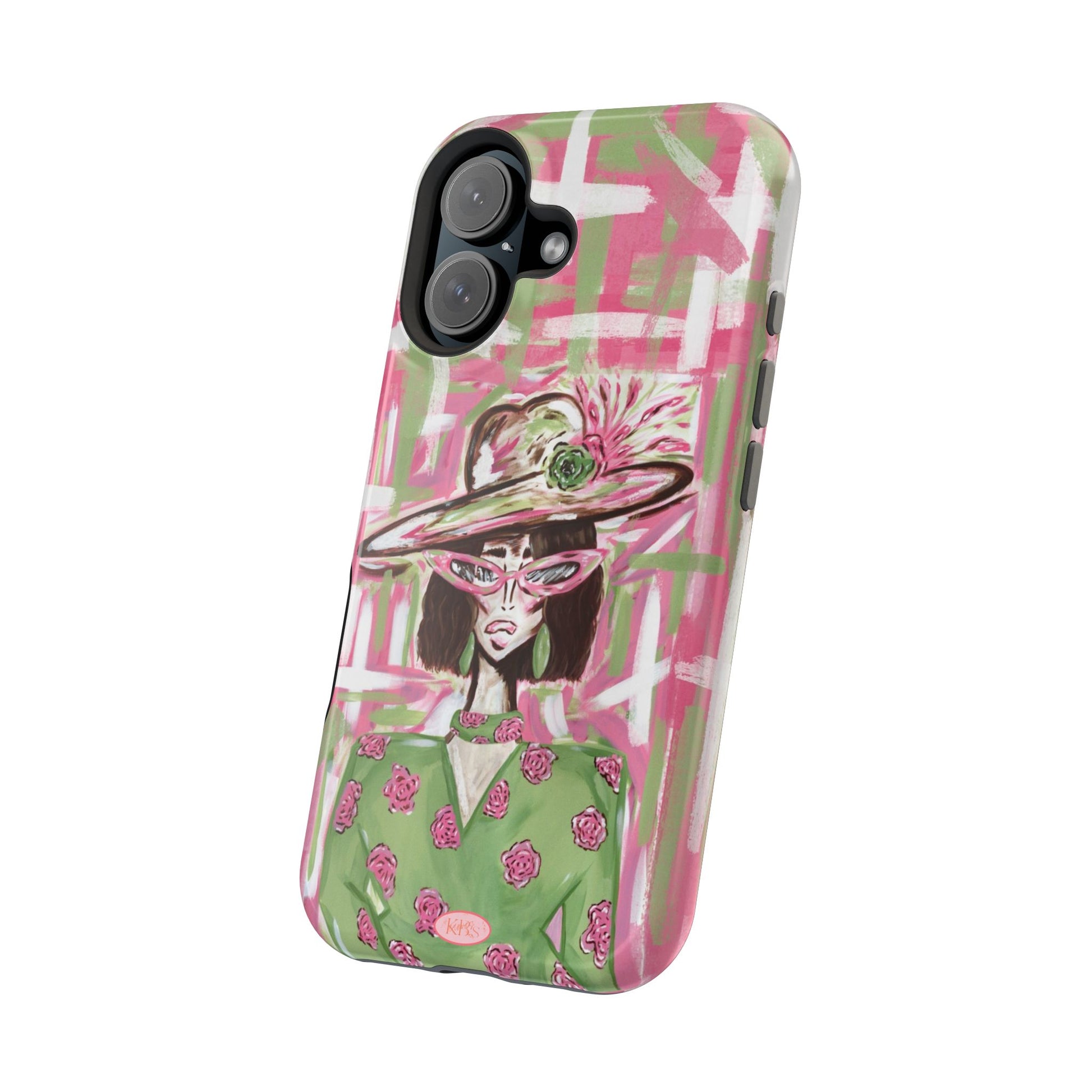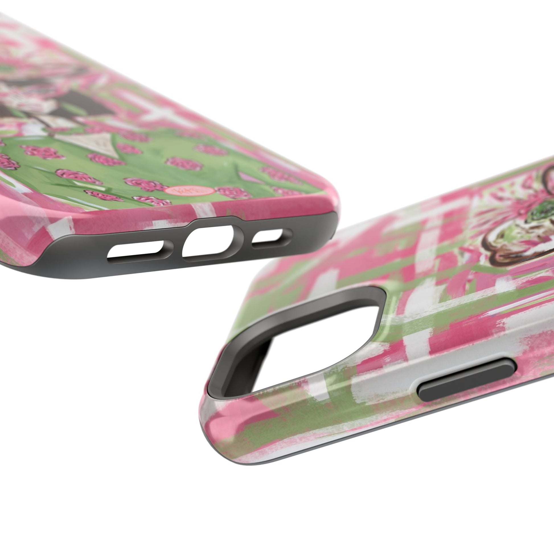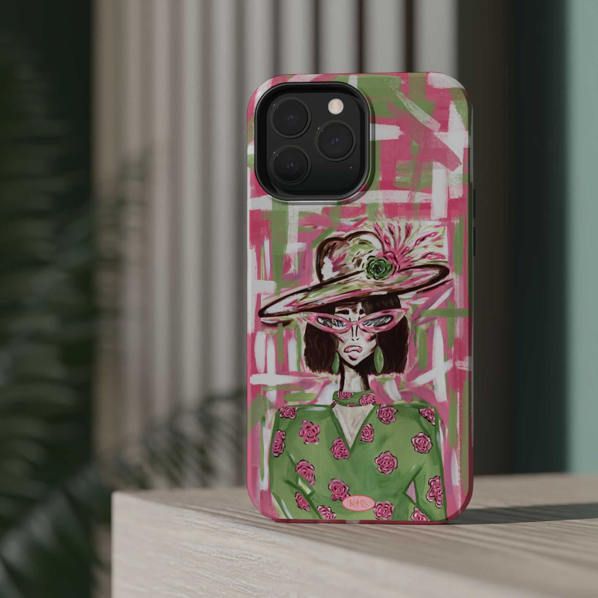 This phone case wraps bold, hand-painted style artwork in a sturdy, impact-resistant shell that keeps your device safe while showing off a playful, fashion-forward look. Bright pinks and soft greens form a layered, graffiti-like background behind a stylized, hat-wearing figure in vintage-inspired attire — a design that reads like street art meets couture. The slim dual-layer build (polycarbonate outer shell + cushioned TPU liner) absorbs shocks and guards against scratches, while the full-wrap print and choice of glossy or matte finish keep the colors vibrant. Built-in magnets support MagSafe-style accessories so the case fits easily into a modern mobile routine without losing flair.