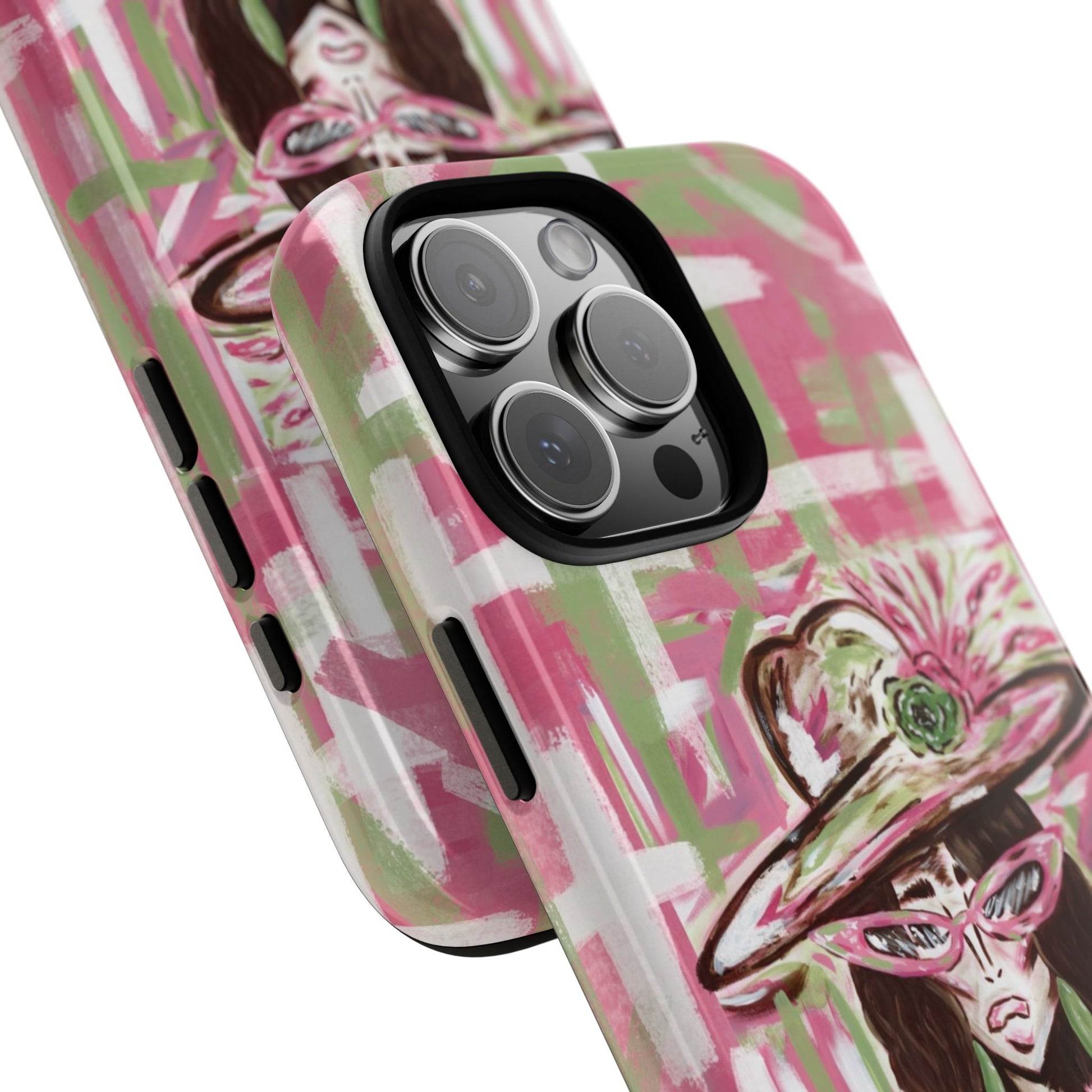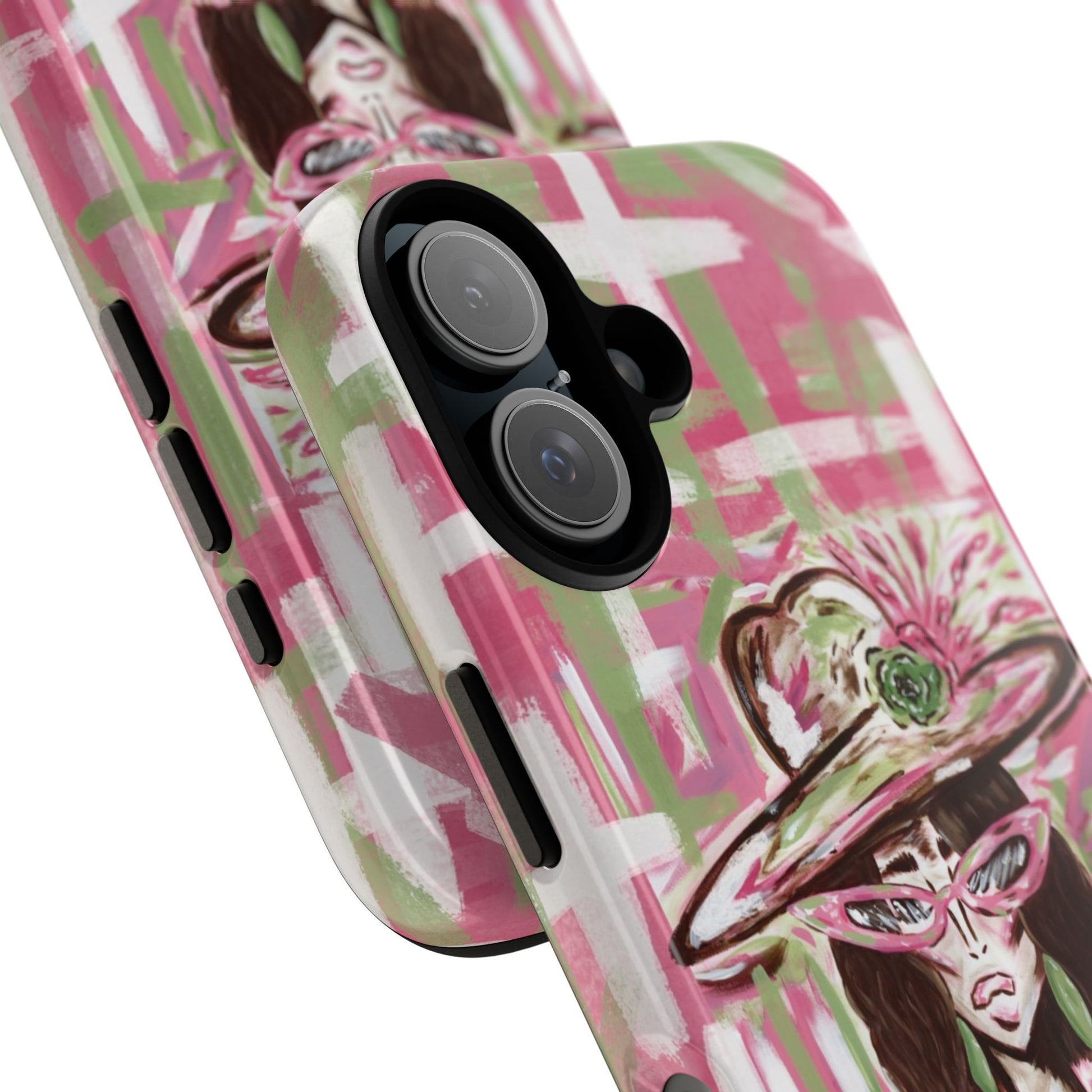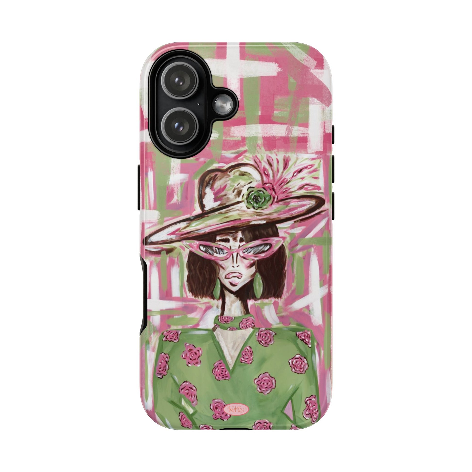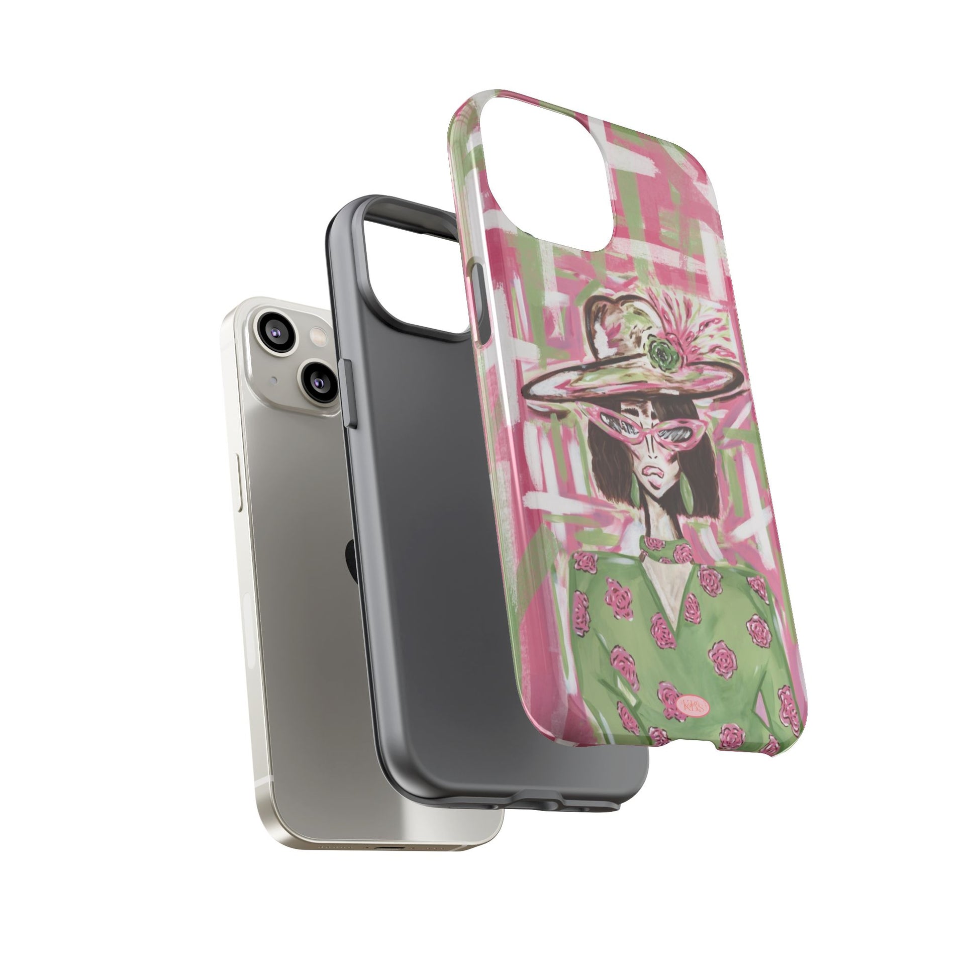This slim, dual-layer phone case wraps your device in playful, hand-drawn style. A sketchy, fashion-forward figure in a wide-brim hat and rose-patterned dress is printed edge-to-edge with vivid 3D wrap transfer and UV protection, so the lively pinks and greens keep their charm outdoors. The tough polycarbonate shell plus a soft TPU silicone liner absorb shocks and resist impacts while maintaining clear port access and wireless charging compatibility. Lightweight and glossy (or matte) finished, it brings an artistic, wearable illustration to everyday carry — an expressive shield for phones that travel from coffee shops to city streets.