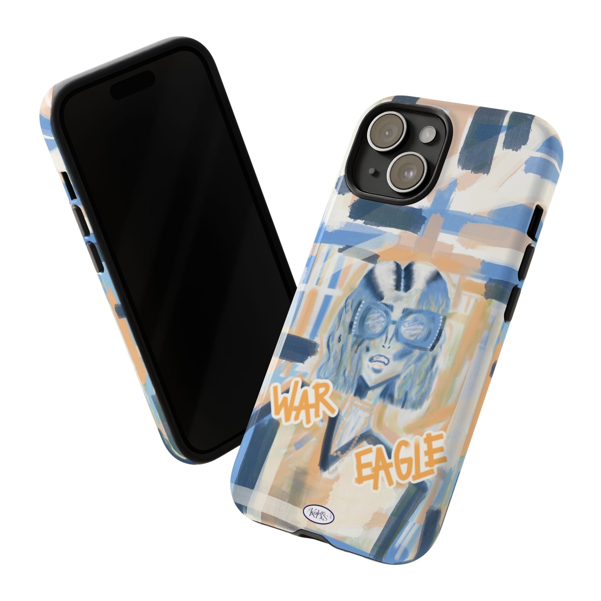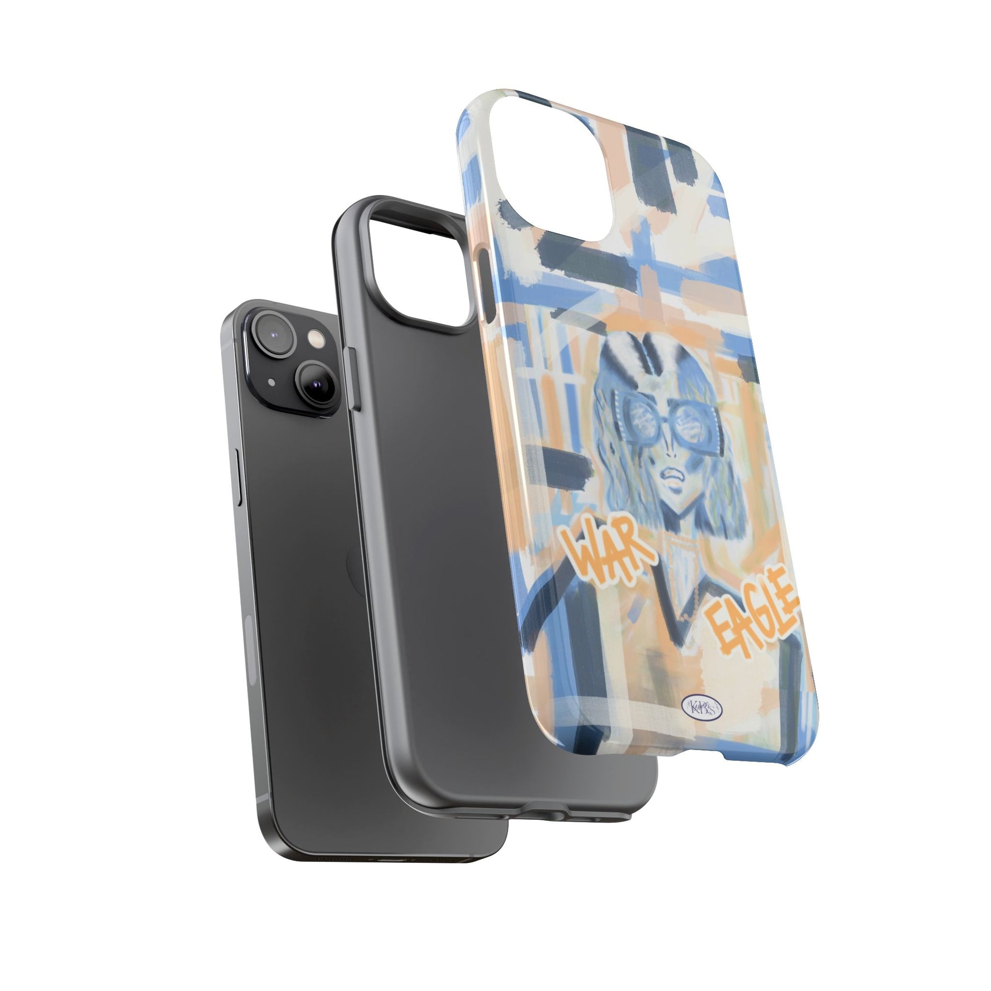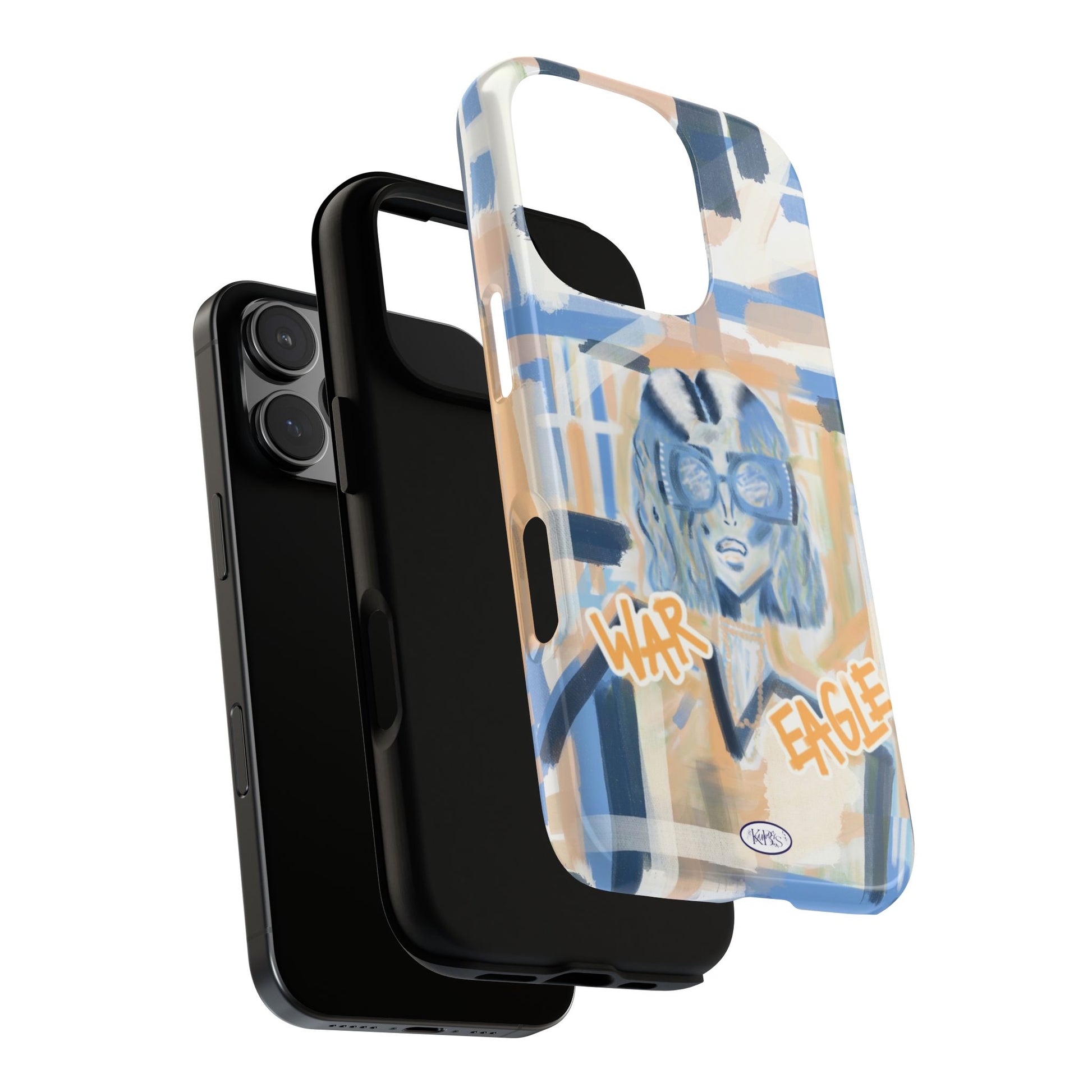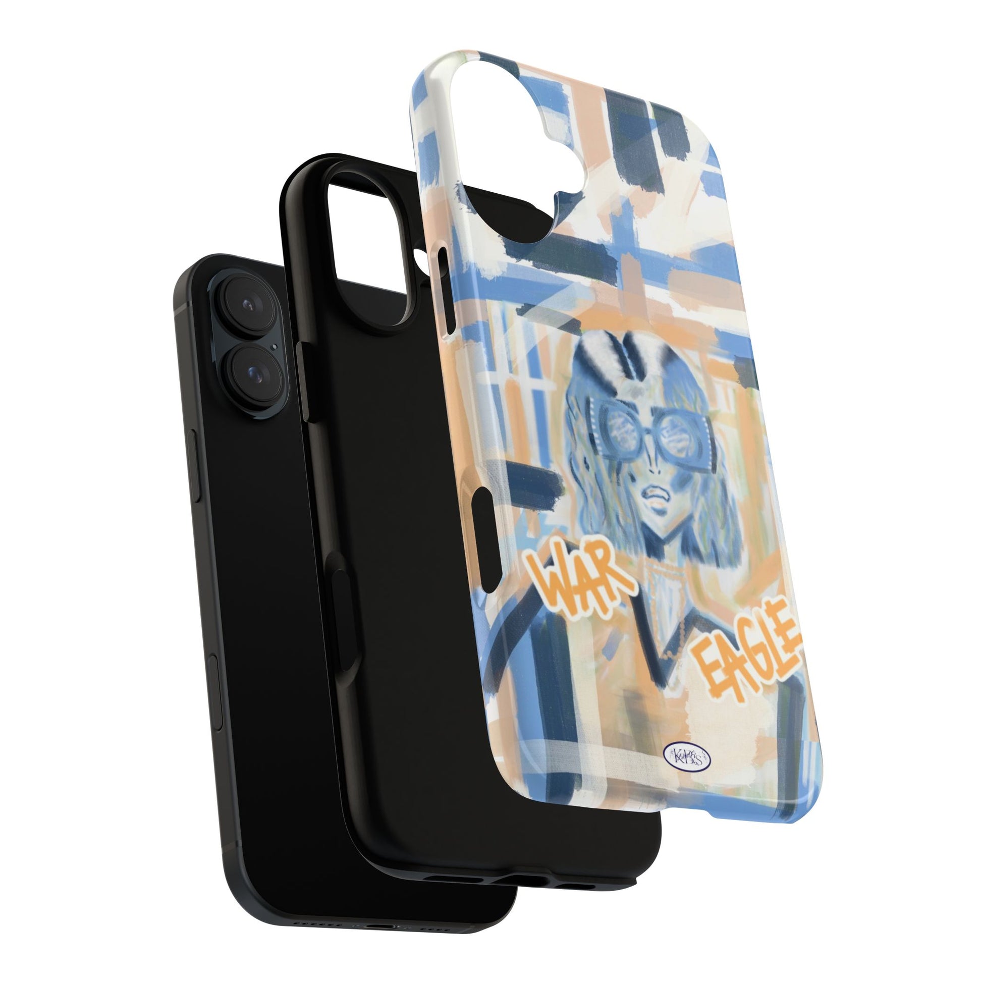 This tough phone case brings street-art energy into everyday life. Soft blue and sandy brushstrokes form an urban backdrop for a bold illustrated figure wearing chunky glasses and a confident stare. Handwritten-style text—'War' and 'Eagle'—adds grit and attitude. The dual-layer shell feels substantial in hand while the glossy/matte print keeps the artwork vibrant. It’s the kind of case that stands out on a crowded table and quietly guards your phone through the day.