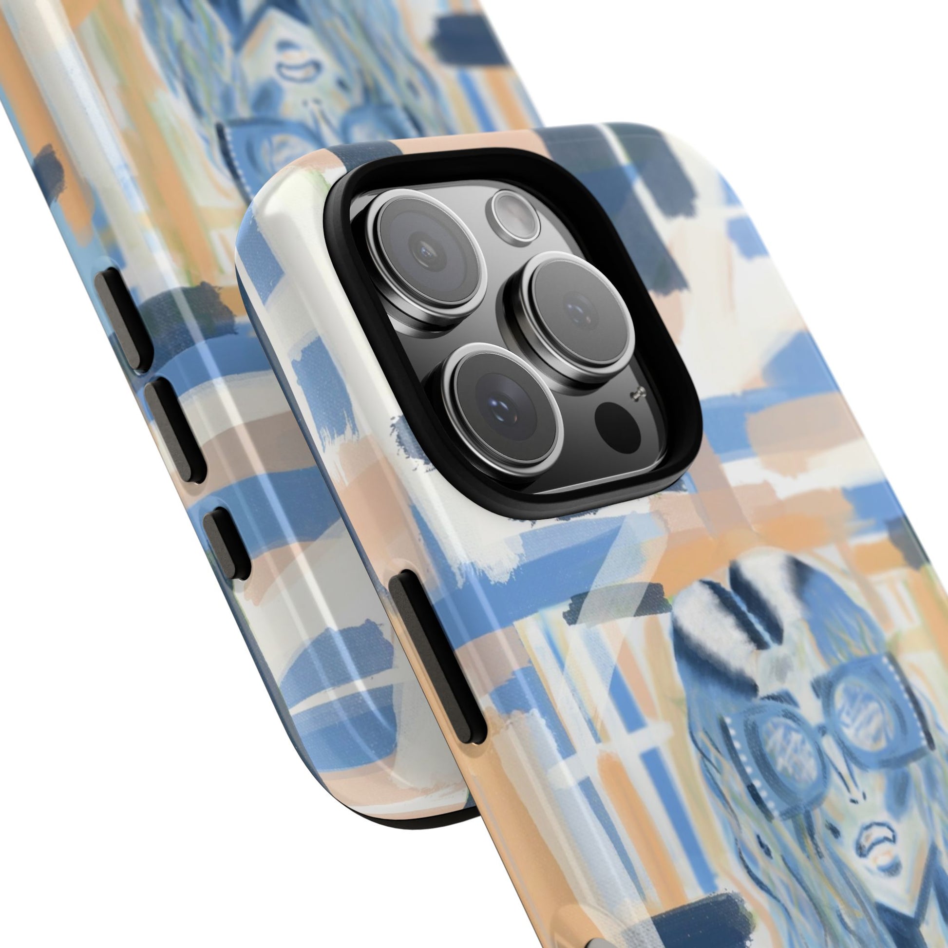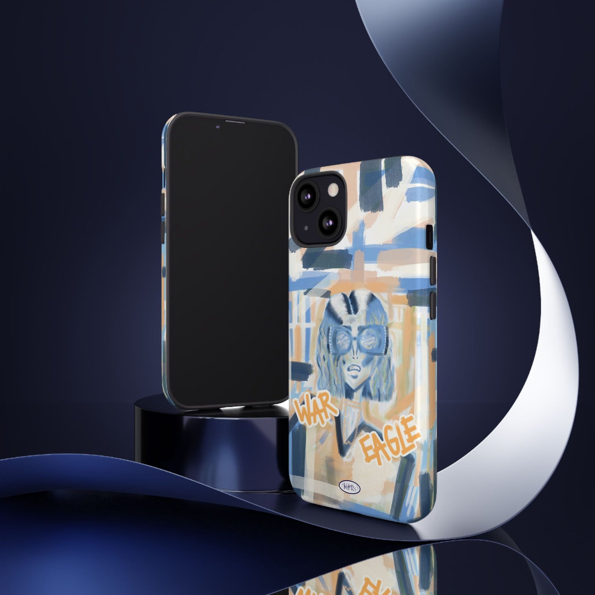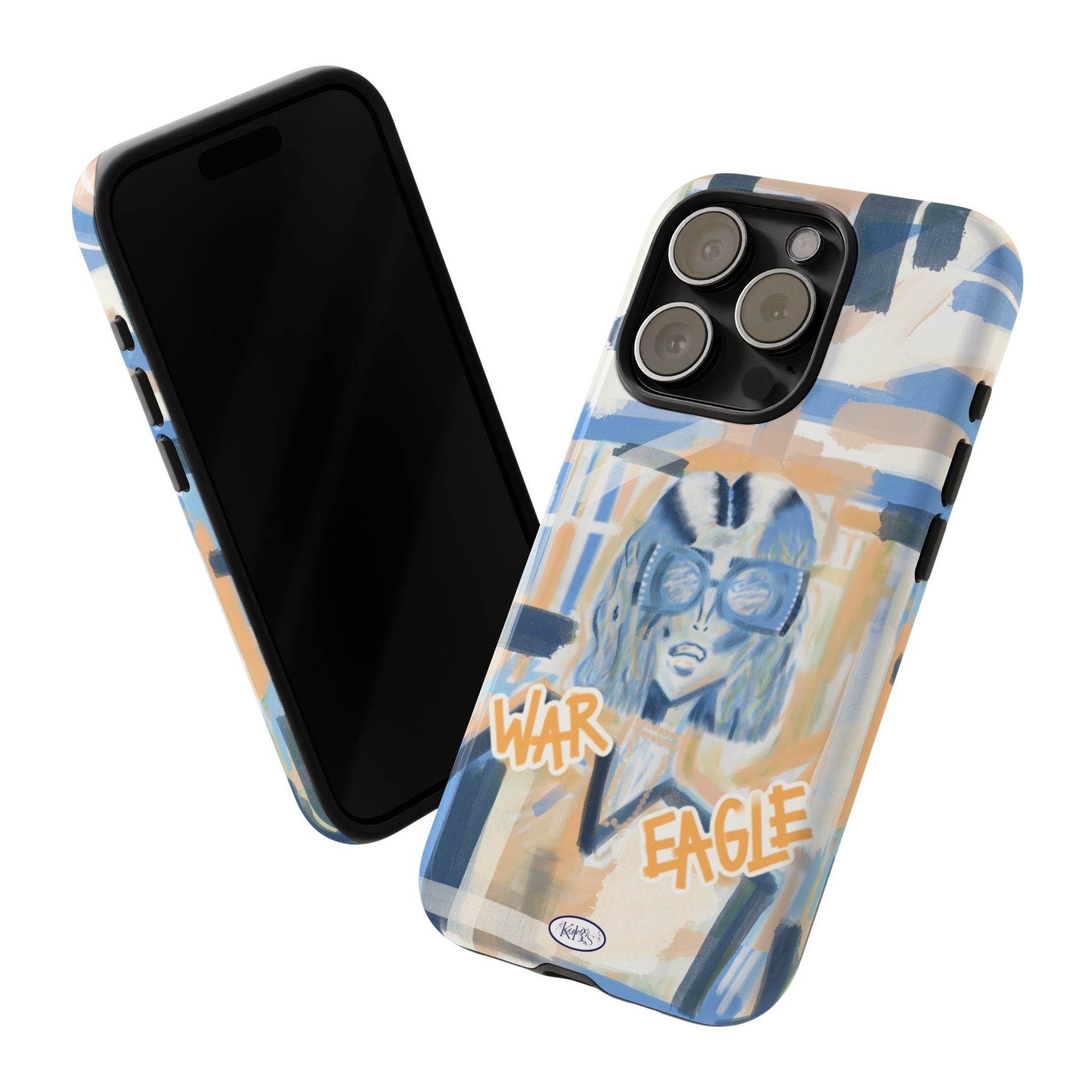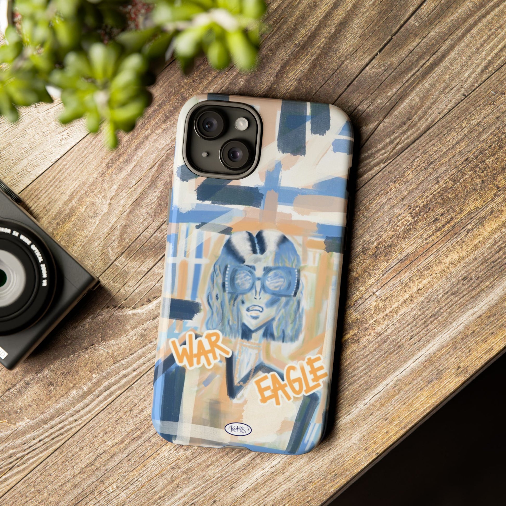 This tough phone case brings street-art energy into everyday life. Soft blue and sandy brushstrokes form an urban backdrop for a bold illustrated figure wearing chunky glasses and a confident stare. Handwritten-style text—'War' and 'Eagle'—adds grit and attitude. The dual-layer shell feels substantial in hand while the glossy/matte print keeps the artwork vibrant. It’s the kind of case that stands out on a crowded table and quietly guards your phone through the day.