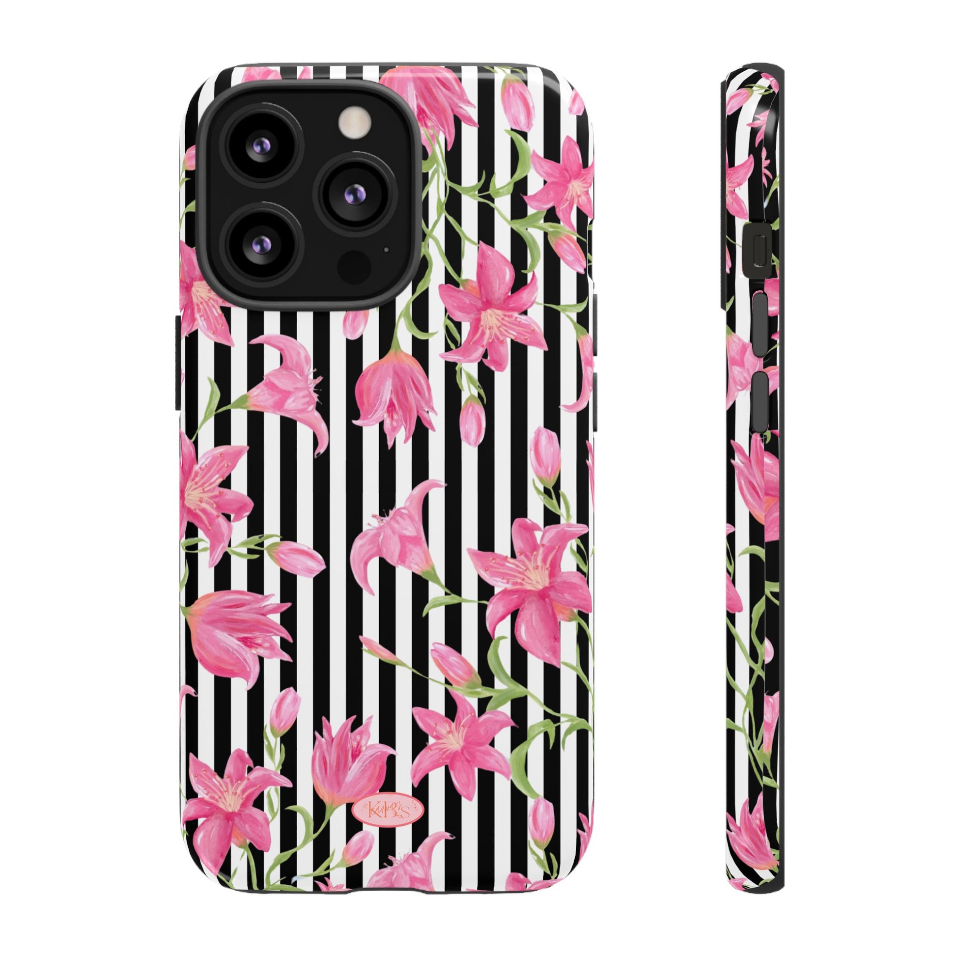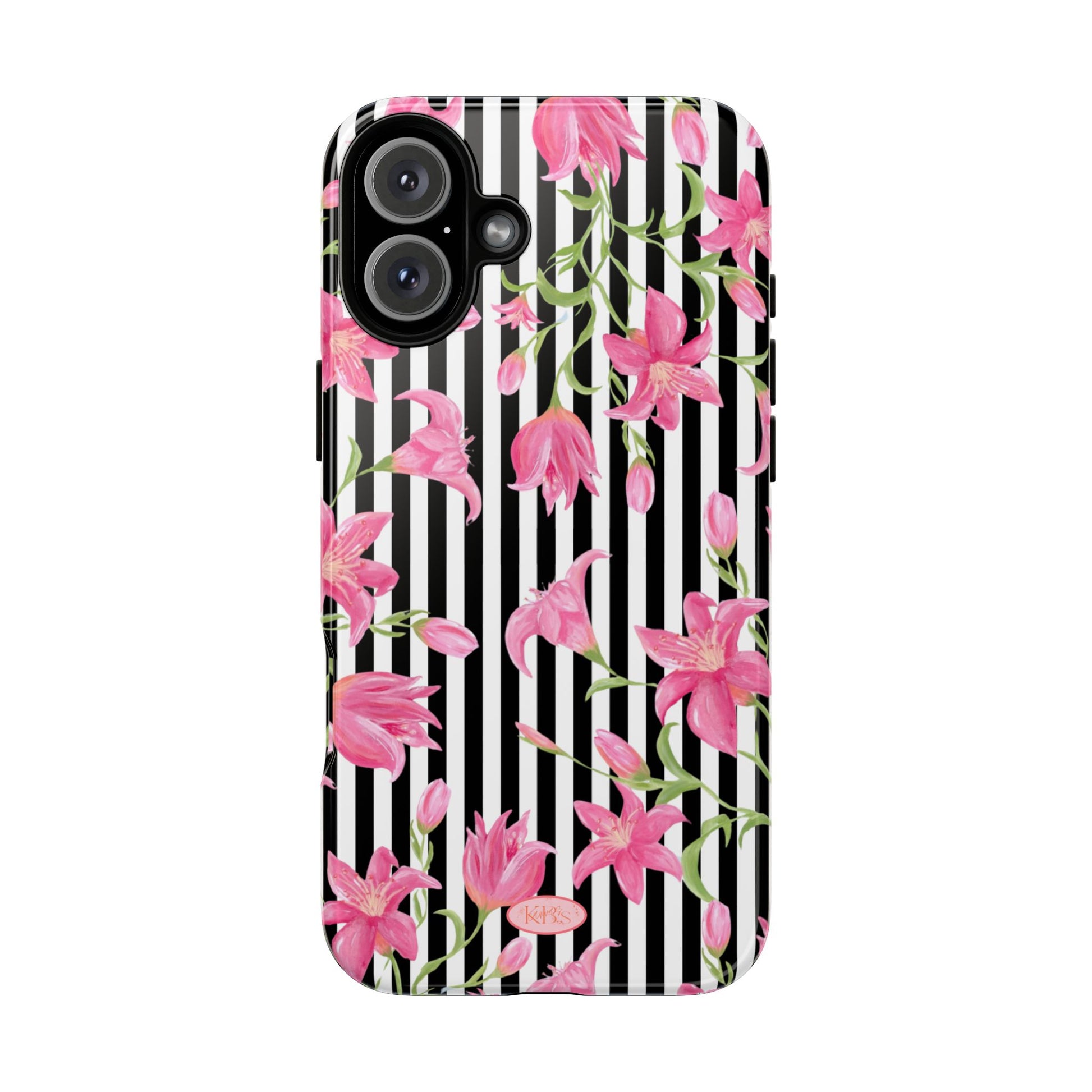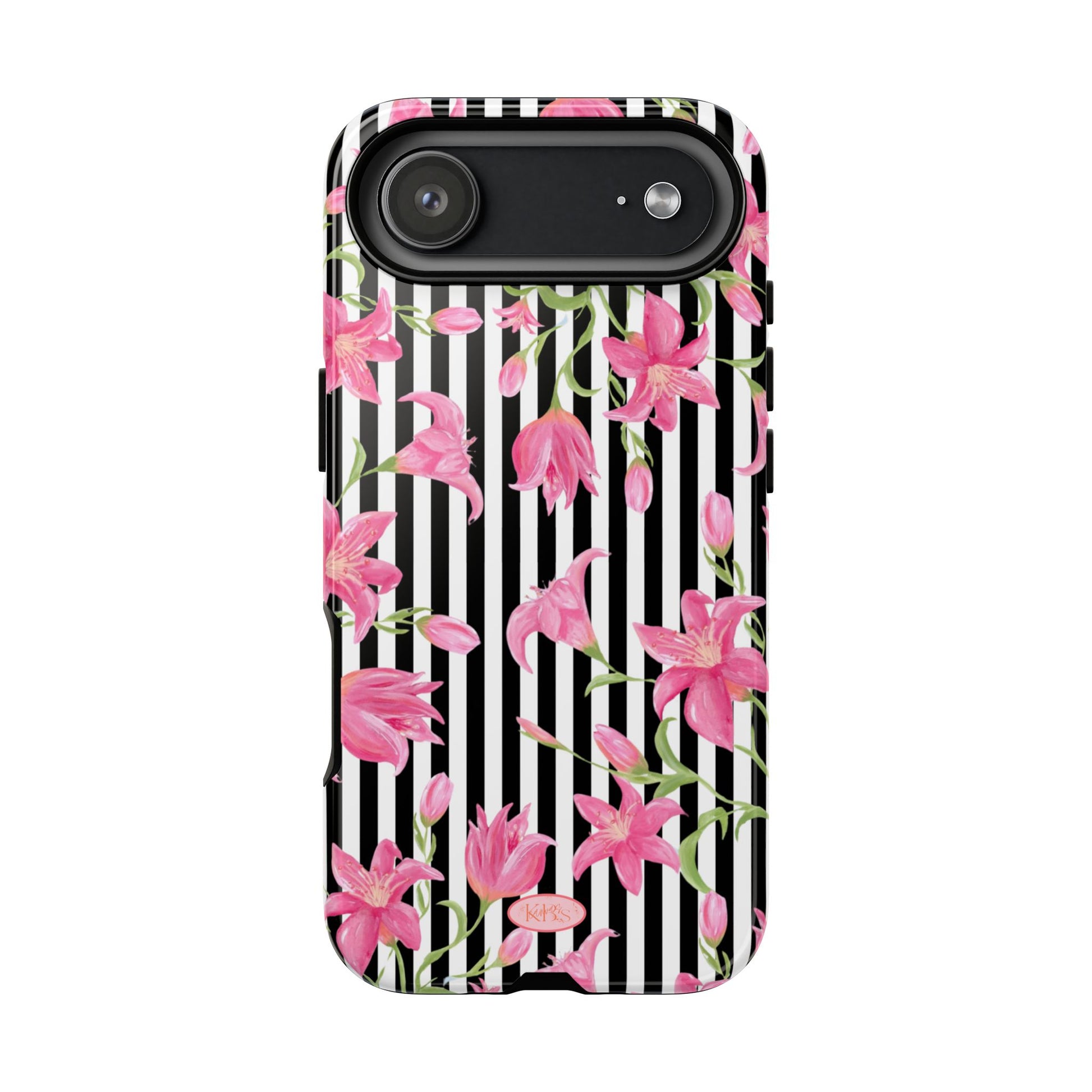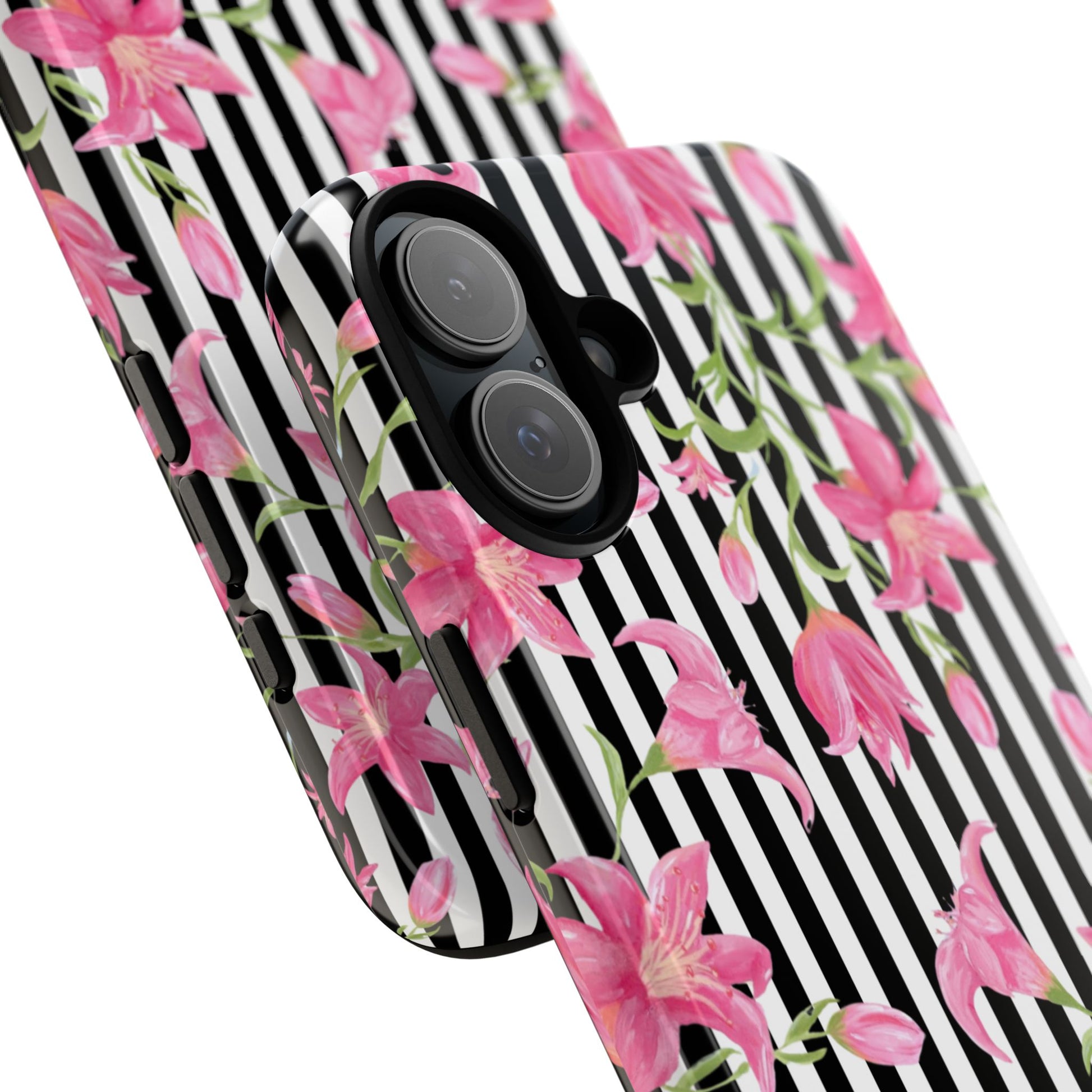 A slim, protective phone case that pairs bold stripes with delicate pink blooms for a look that's both graphic and feminine. The dual-layer shell combines a rigid polycarbonate exterior with a soft TPU silicone liner to absorb shocks and resist drops. A high-density 3D wrap captures the floral artwork edge-to-edge, while UV-resistant inks help keep colors vivid outdoors. Thoughtful cutouts keep ports accessible and wireless charging works through the case. This design brings a fresh, fashion-forward accent to everyday carry — brightening commutes, coffee runs, and hands-on moments with a confident, floral statement.