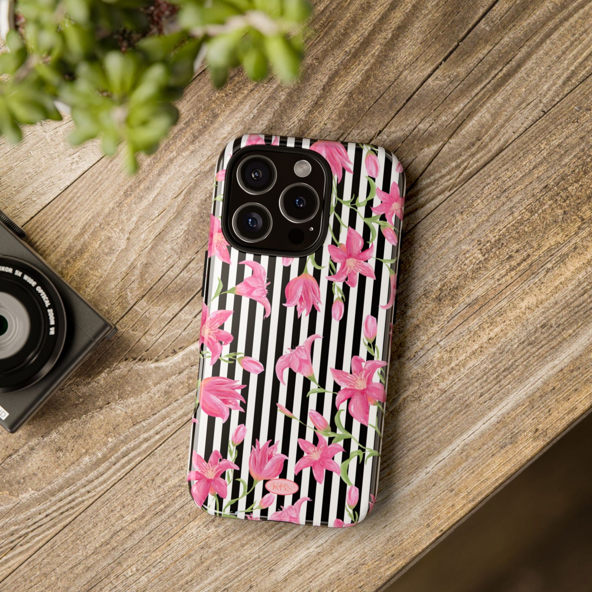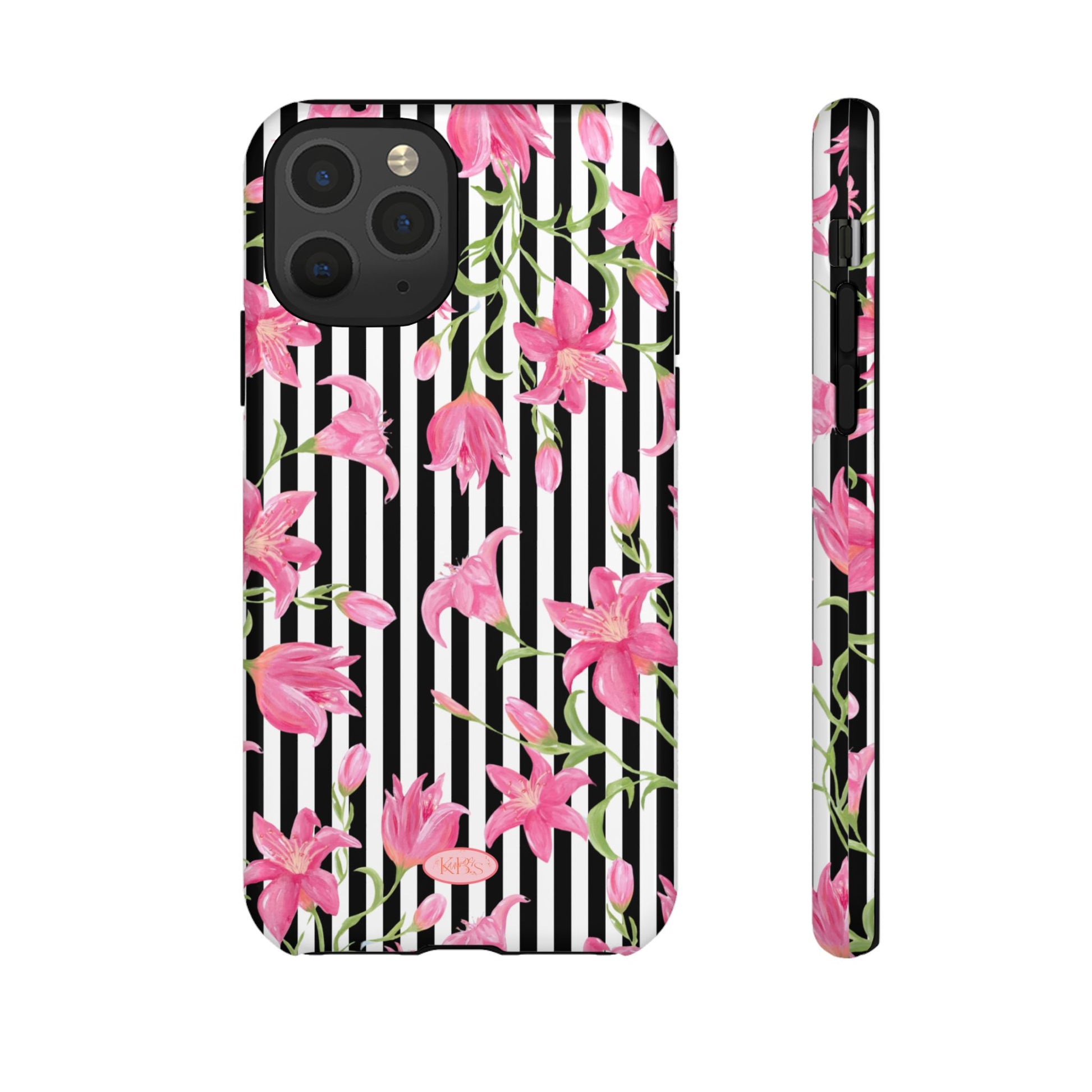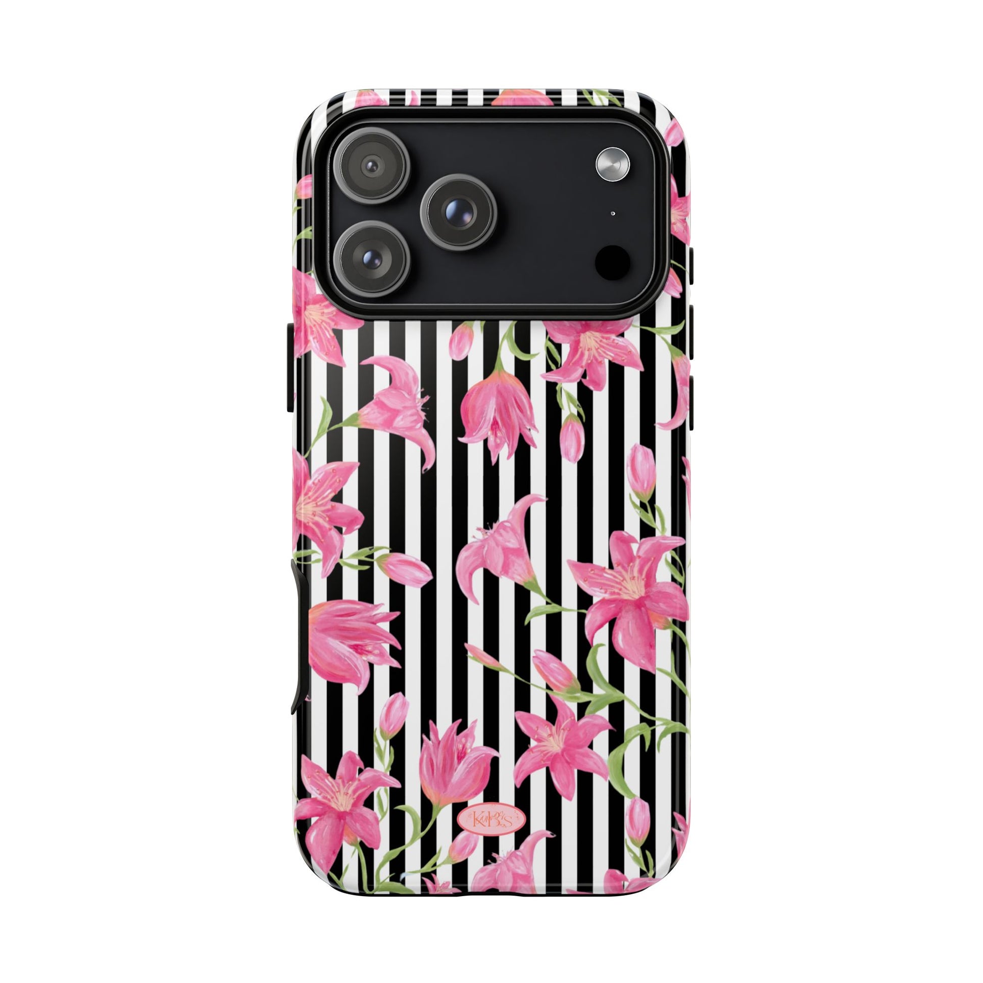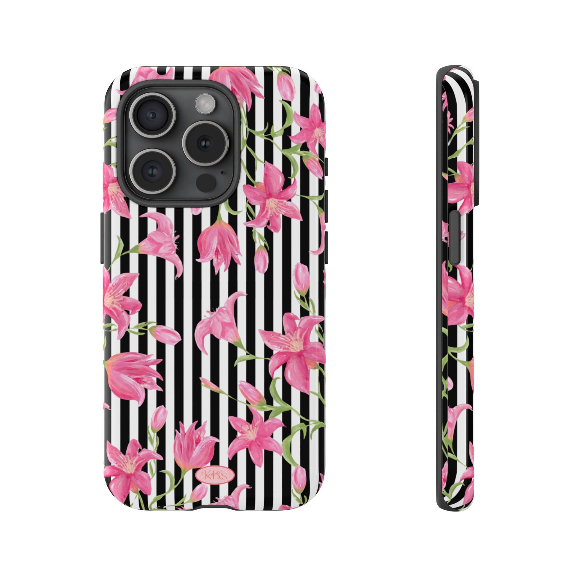 A slim, protective phone case that pairs bold stripes with delicate pink blooms for a look that's both graphic and feminine. The dual-layer shell combines a rigid polycarbonate exterior with a soft TPU silicone liner to absorb shocks and resist drops. A high-density 3D wrap captures the floral artwork edge-to-edge, while UV-resistant inks help keep colors vivid outdoors. Thoughtful cutouts keep ports accessible and wireless charging works through the case. This design brings a fresh, fashion-forward accent to everyday carry — brightening commutes, coffee runs, and hands-on moments with a confident, floral statement.