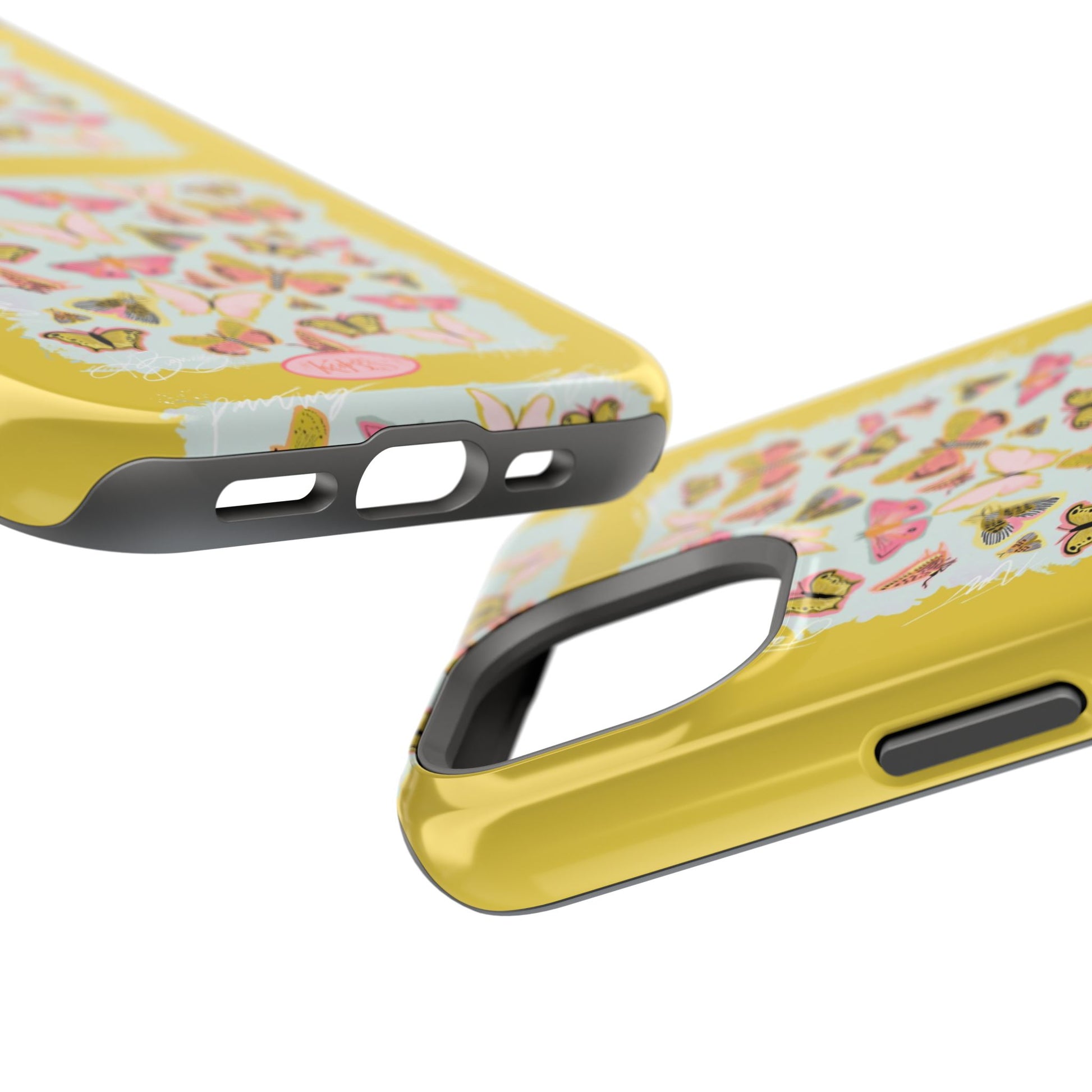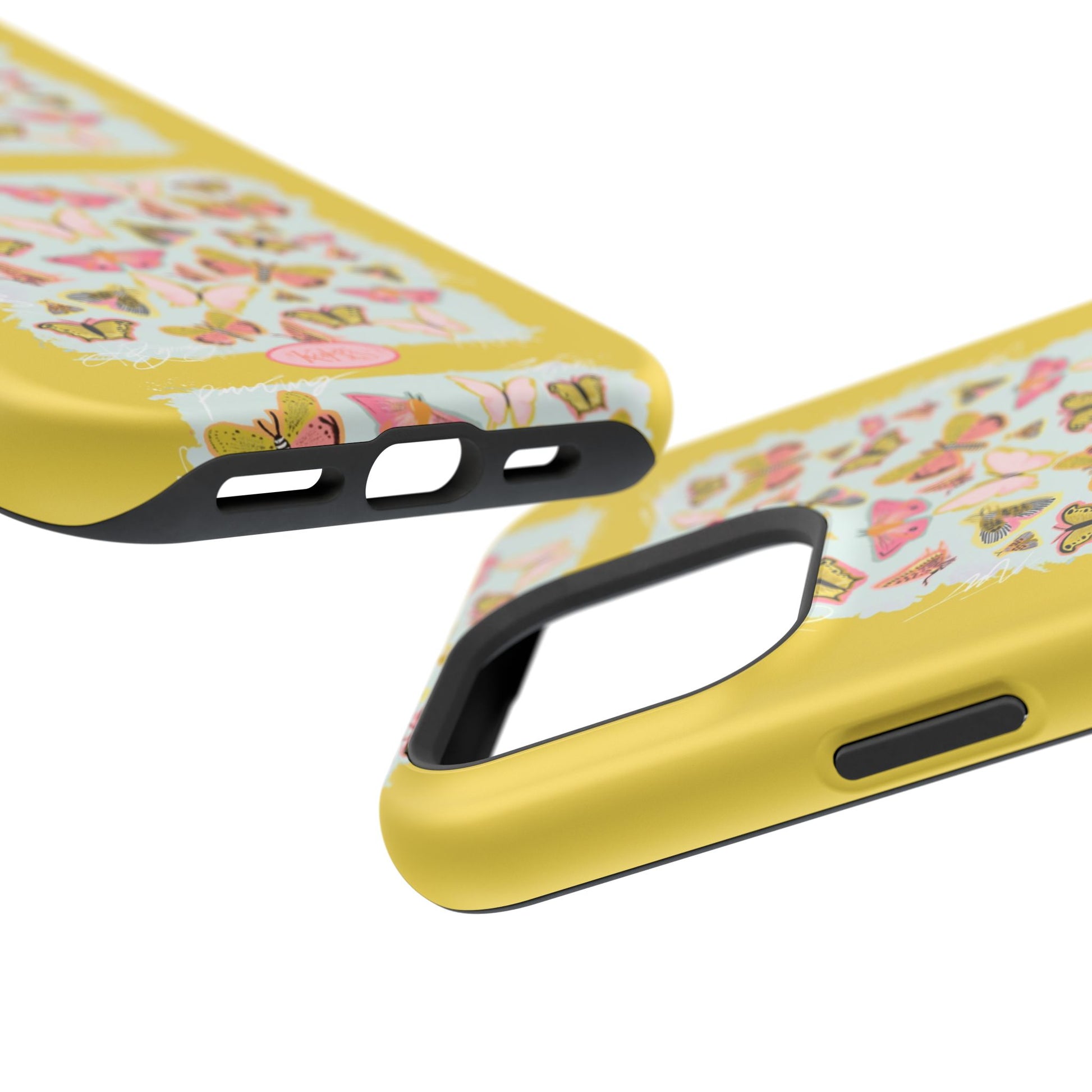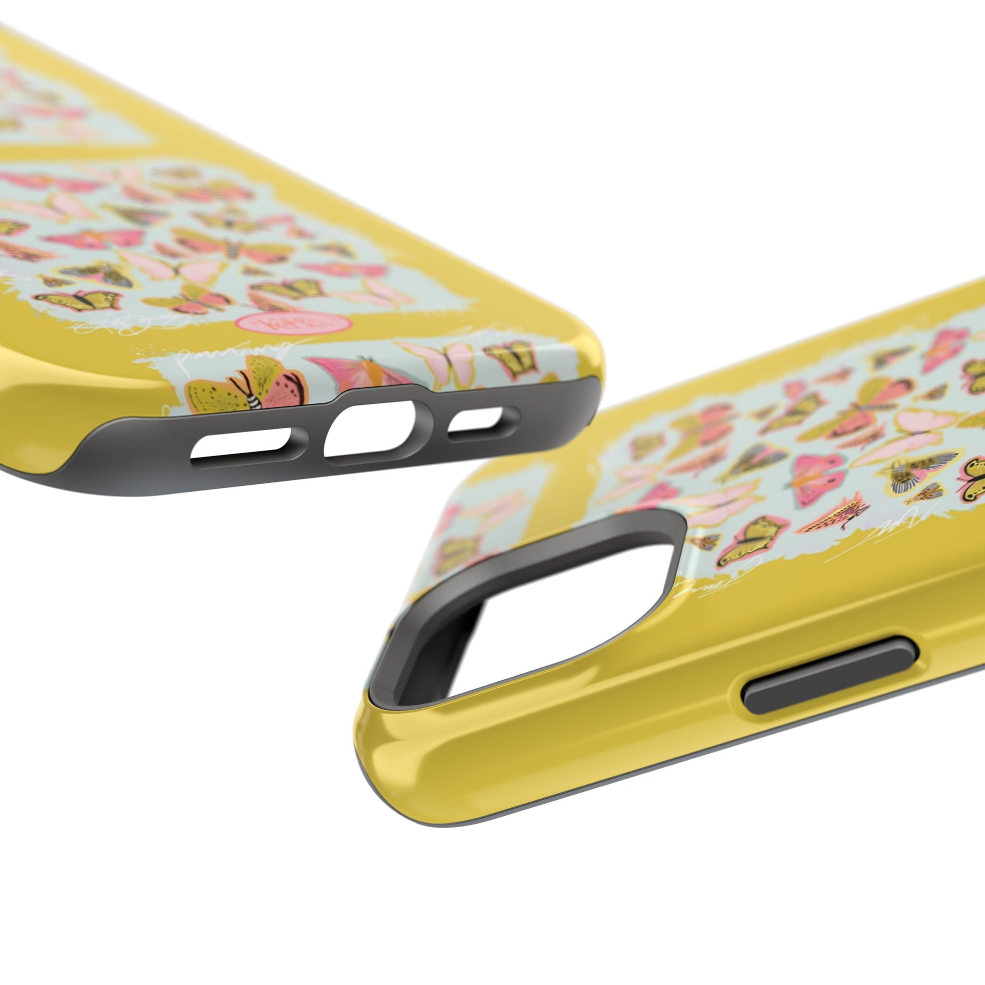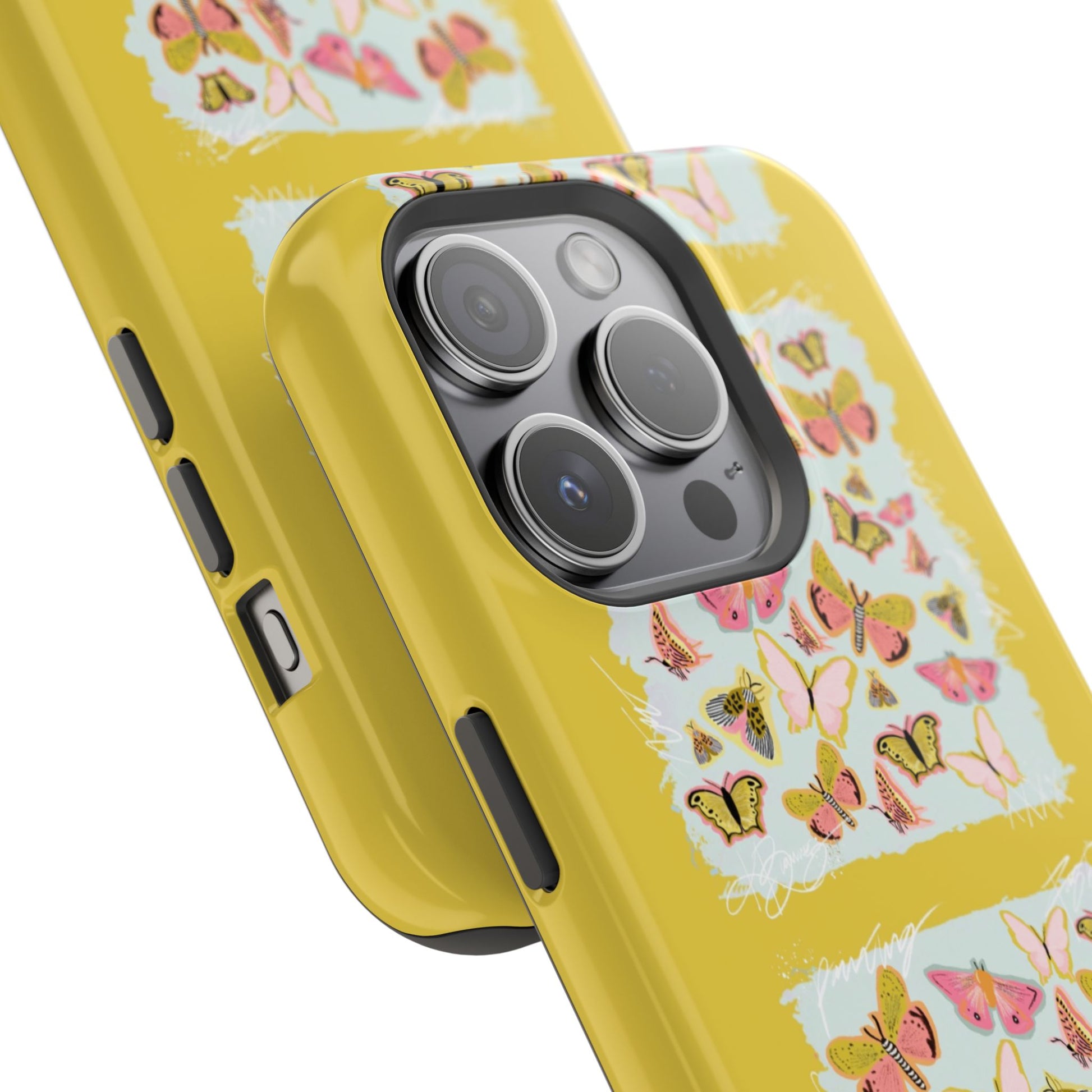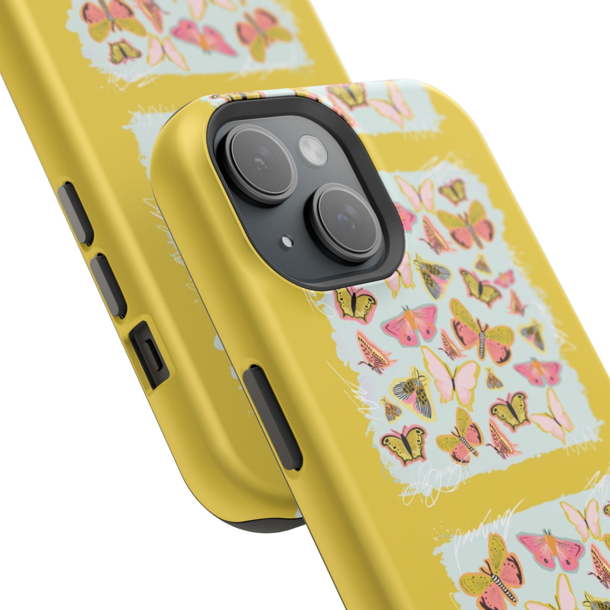 Sunlit and joyful, this protective phone case brings playful, vintage-inspired butterflies into everyday moments. The full-wrap print shows repeated panels of soft pink and yellow butterflies framed against a pale textured background, set on a sunny mustard backdrop that lifts your phone with warm color. The slim-but-sturdy dual-layer build keeps your device safe from scratches and light impacts while letting the colorful design stay front and center. It slips into your routine — clipped into a bag, set on a café table, or used with MagSafe-compatible chargers — and adds a cheerful, handcrafted feel to daily life.
