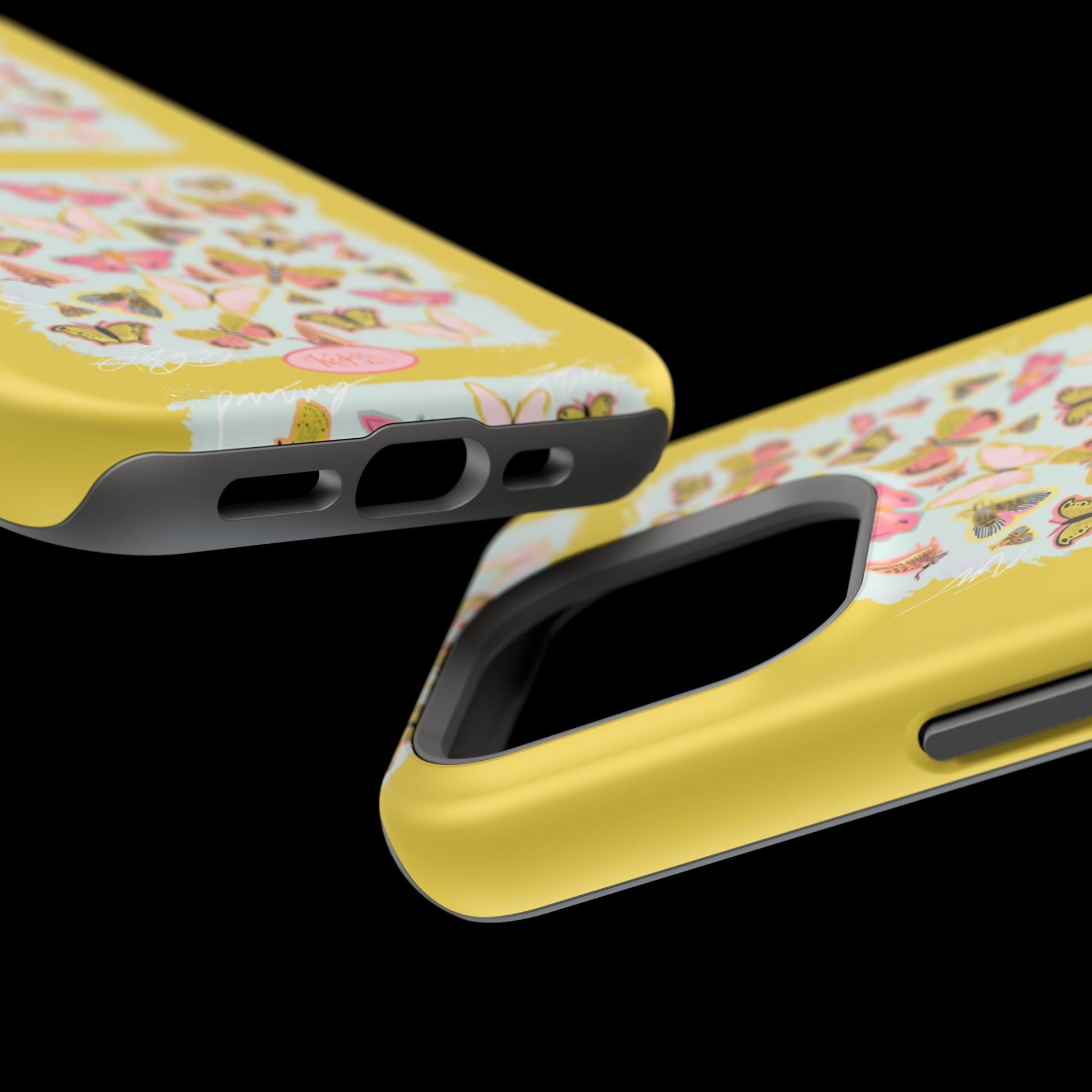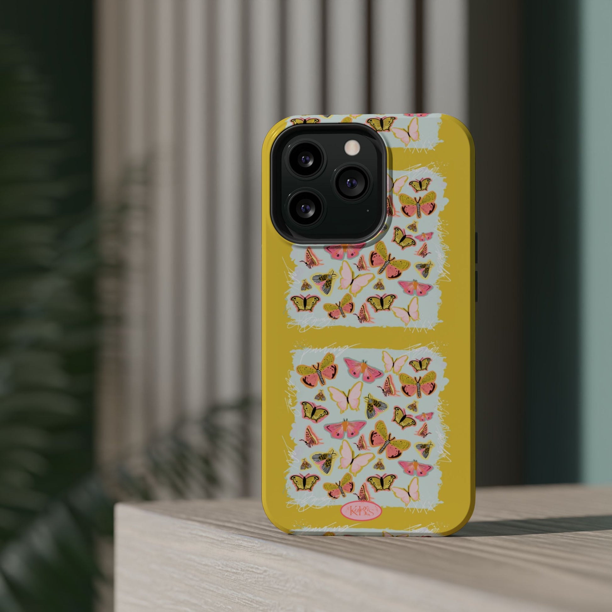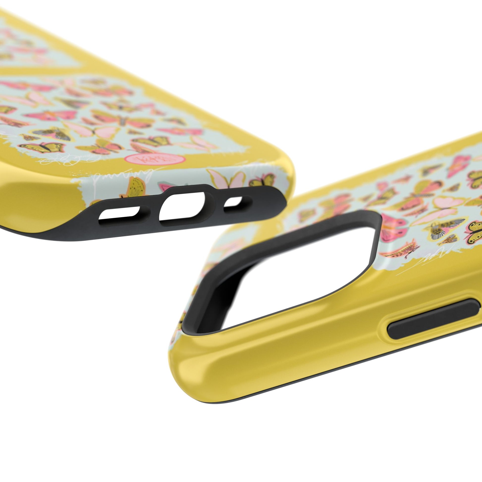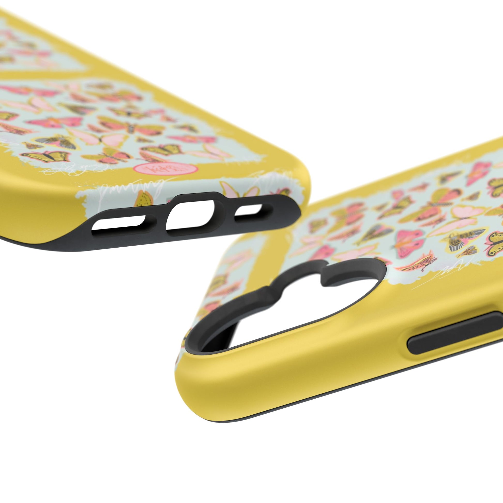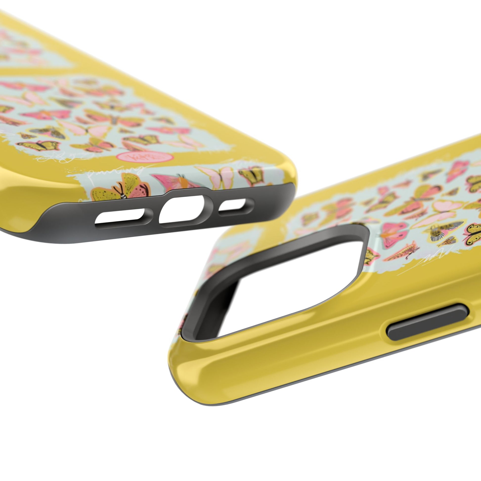 Sunlit and joyful, this protective phone case brings playful, vintage-inspired butterflies into everyday moments. The full-wrap print shows repeated panels of soft pink and yellow butterflies framed against a pale textured background, set on a sunny mustard backdrop that lifts your phone with warm color. The slim-but-sturdy dual-layer build keeps your device safe from scratches and light impacts while letting the colorful design stay front and center. It slips into your routine — clipped into a bag, set on a café table, or used with MagSafe-compatible chargers — and adds a cheerful, handcrafted feel to daily life.