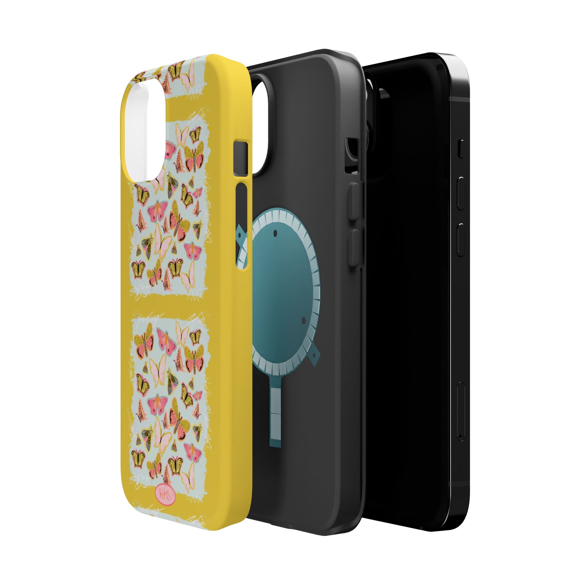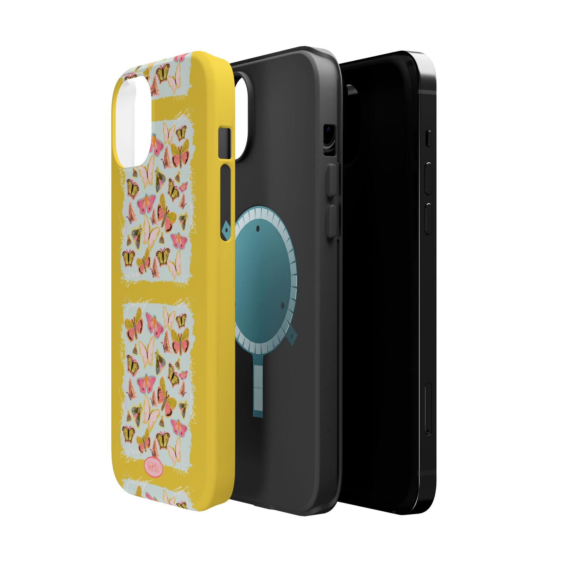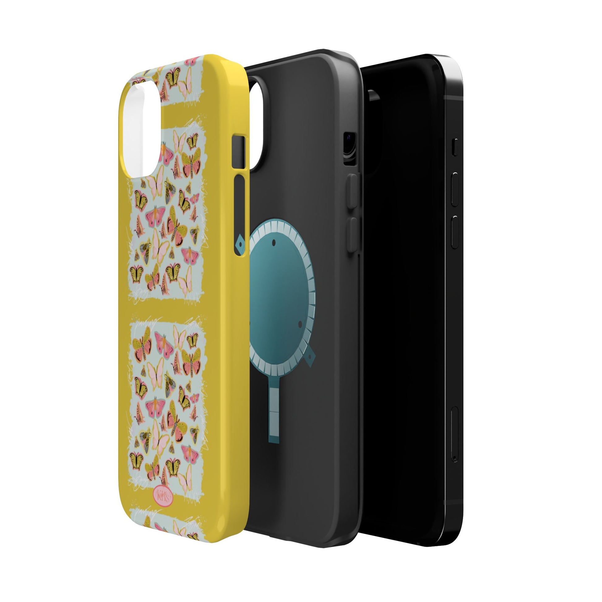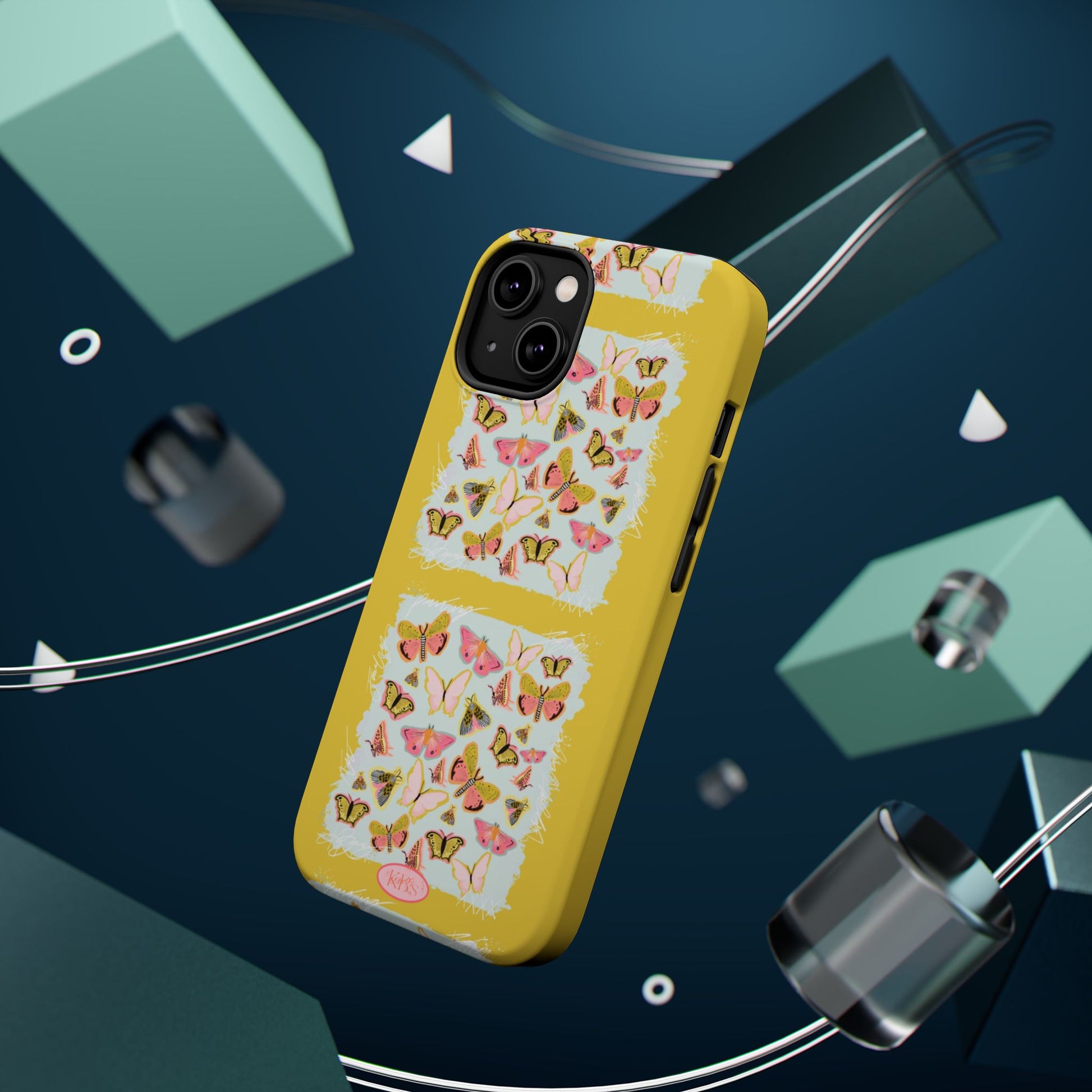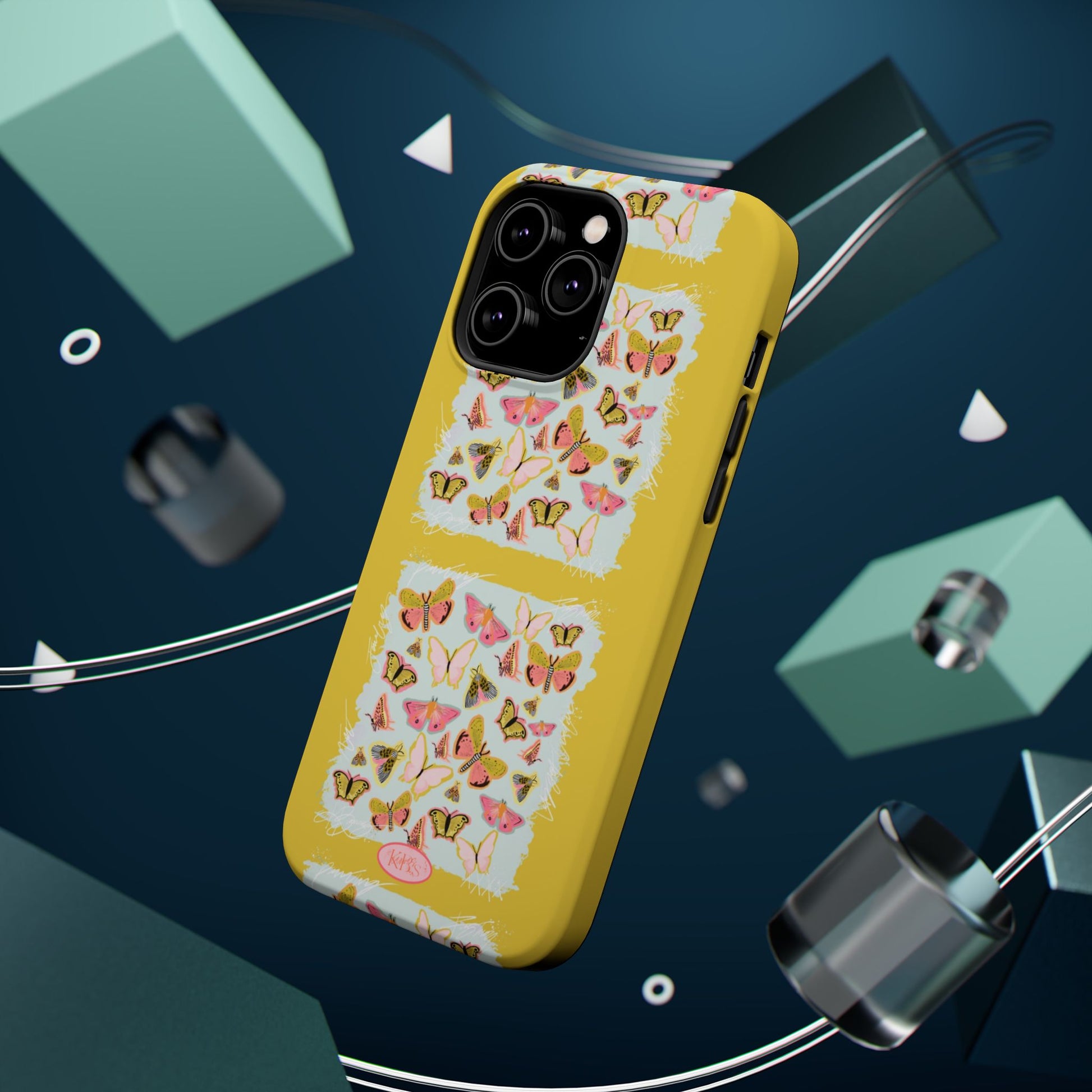Sunlit and joyful, this protective phone case brings playful, vintage-inspired butterflies into everyday moments. The full-wrap print shows repeated panels of soft pink and yellow butterflies framed against a pale textured background, set on a sunny mustard backdrop that lifts your phone with warm color. The slim-but-sturdy dual-layer build keeps your device safe from scratches and light impacts while letting the colorful design stay front and center. It slips into your routine — clipped into a bag, set on a café table, or used with MagSafe-compatible chargers — and adds a cheerful, handcrafted feel to daily life.