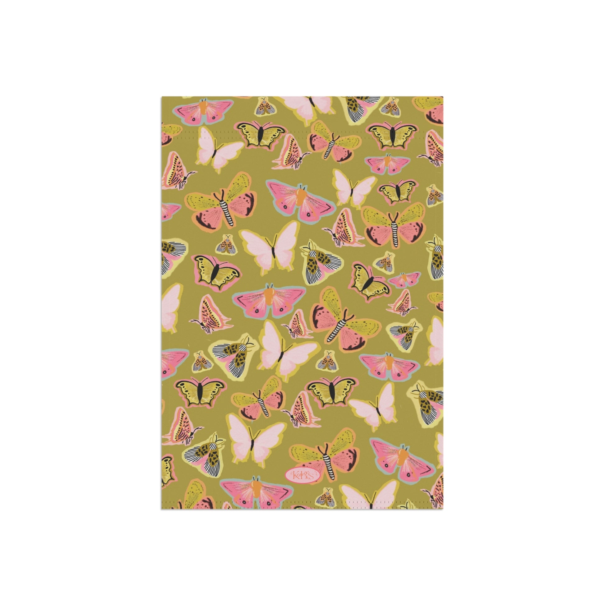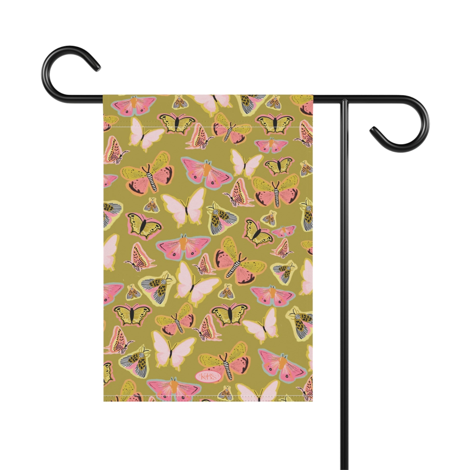 Bring a gentle bit of garden whimsy to your doorway with this lightweight decorative banner. Soft olive-green grounds a flutter of hand-drawn moths and butterflies in warm pinks, creams, and muted corals — a quiet, vintage-inspired pattern that feels like a sunlit afternoon among flower beds. The fabric drapes easily from a standard garden pole, showing the same art on both sides so the design reads beautifully from any angle. It’s an easy way to add personality to a porch, courtyard, or potted-shelf display and to welcome neighbors with a touch of nature and color.