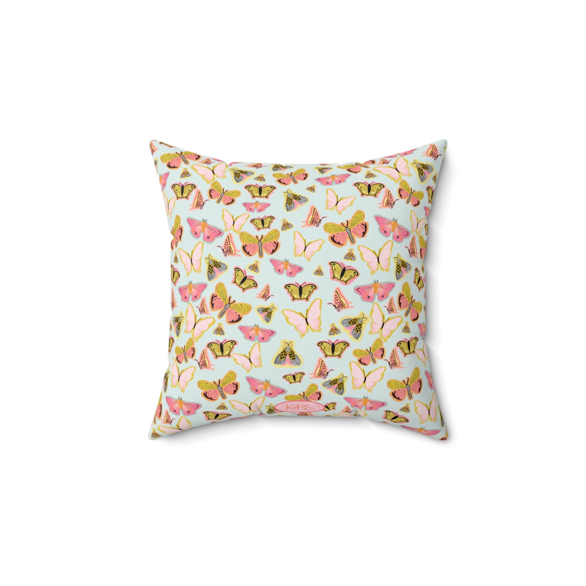 Soft, sunlit afternoons captured in fabric. This square pillow carries a scatter of hand-drawn butterflies in blush pinks and warm golds set against a pale, airy background. It feels light and uplifting—like opening a window to a quiet meadow. Placed on a cozy reading chair, layered on a sofa, or tucked into a sunny window seat, it adds a gentle, feminine touch and a hint of vintage charm to everyday moments. The double-sided print keeps the pattern visible from every angle, while the slightly oversized recycled insert gives the cushion a plush, full look that invites you to lean in and linger.