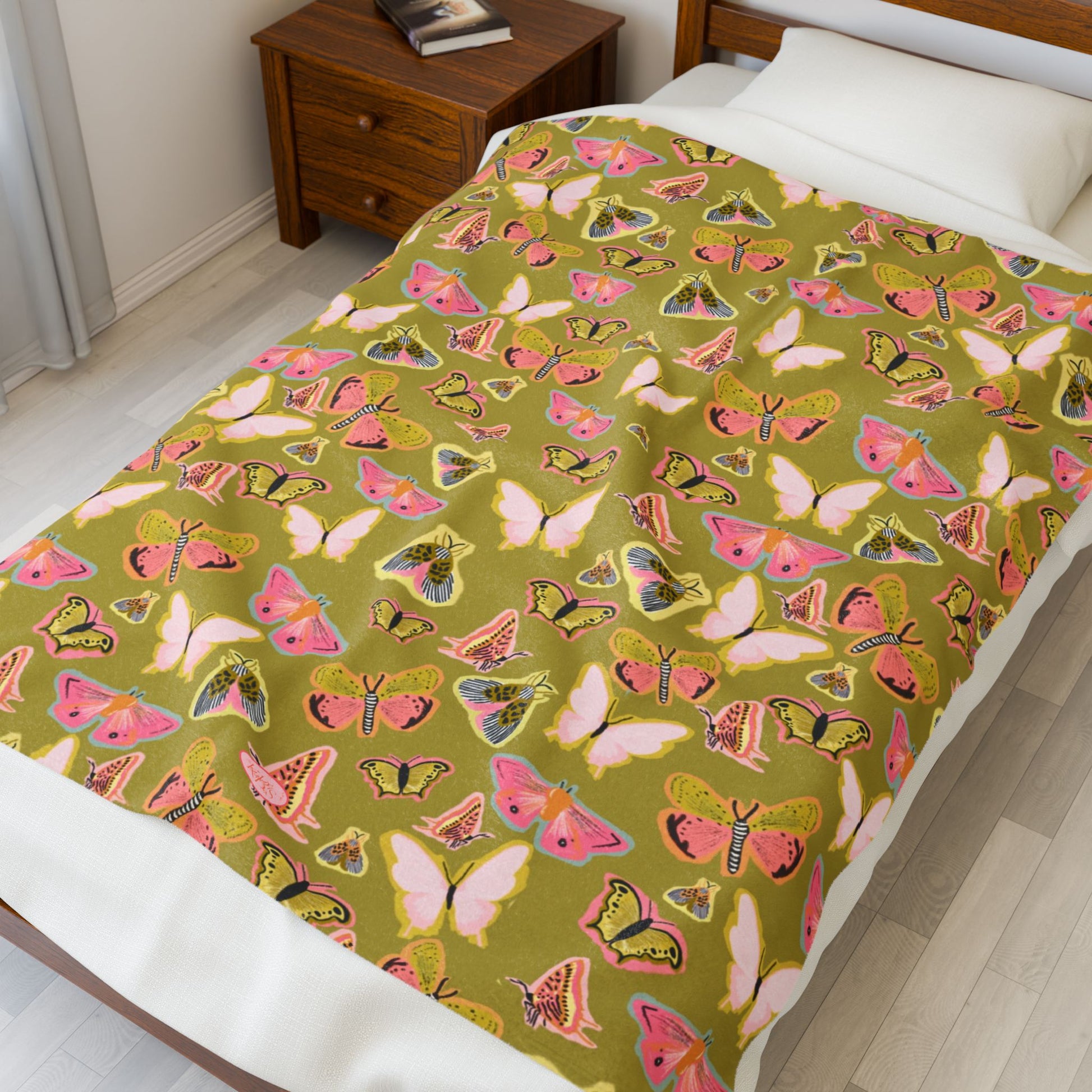 Wrap yourself in a soft, velvety hush: this plush blanket carries a warm olive background scattered with watercolor butterflies in blush, cream, and mint. It feels like a quiet afternoon in a sunlit studio—gentle, tactile, understatedly joyful. Drape it over a reading chair, tuck it around your shoulders on a cool evening, or layer it across the foot of a bed to add a painterly pop to neutral decor. The fabric breathes while still holding cozy warmth, and the one-sided print keeps the colors vivid where they show most. It’s the kind of piece that settles into everyday life and quietly lifts the mood.