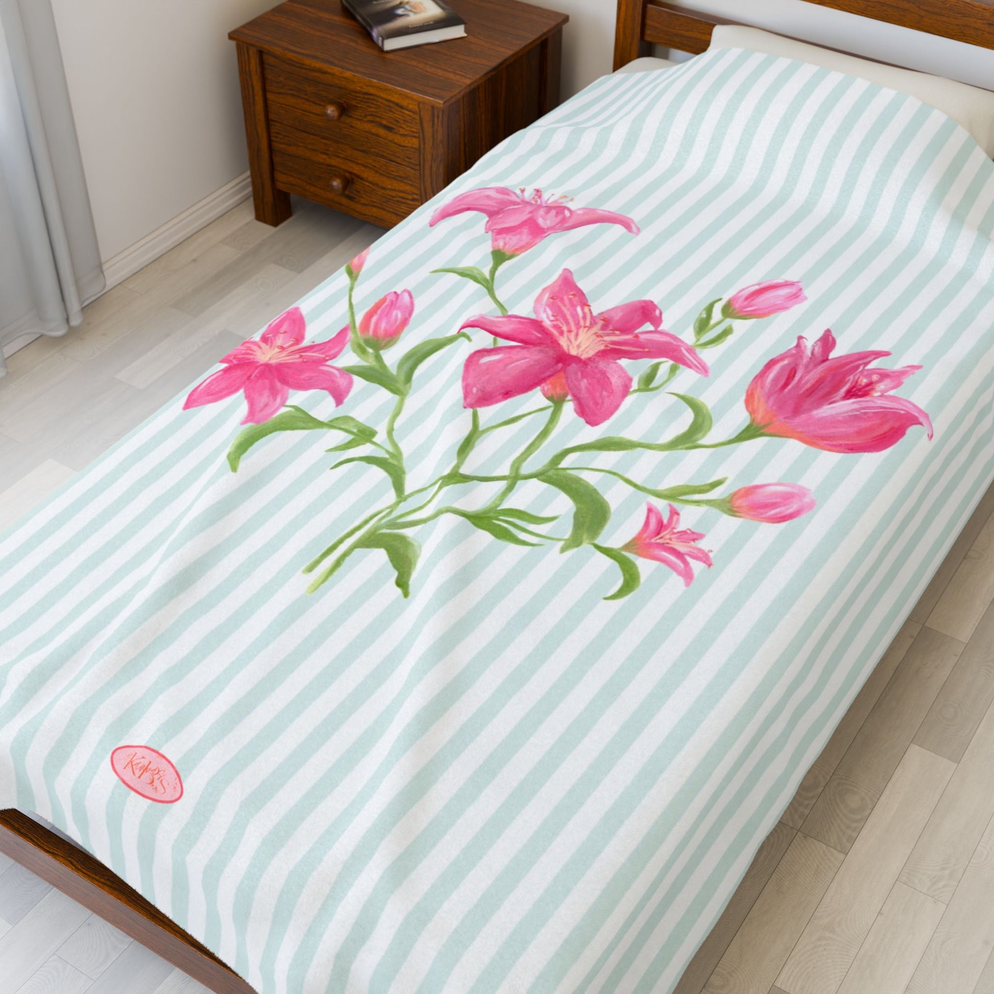 A velvety plush blanket printed with a soft, vintage-inspired bouquet of pink lilies set against subtle mint pinstripes. The surface feels luxuriously smooth, draping warm and lightweight over shoulders or across a couch. It brings calm mornings and slow afternoons into the room—imagine curling up with tea, a book, or a quiet playlist while the floral art adds a gentle, restorative touch to your space. The single-sided high-detail print keeps colors bright without overwhelming a neutral decor. For someone who favors feminine, cottagecore, or botanical accents, this blanket reads like a quiet statement: cozy ritual, considered style, everyday comfort.